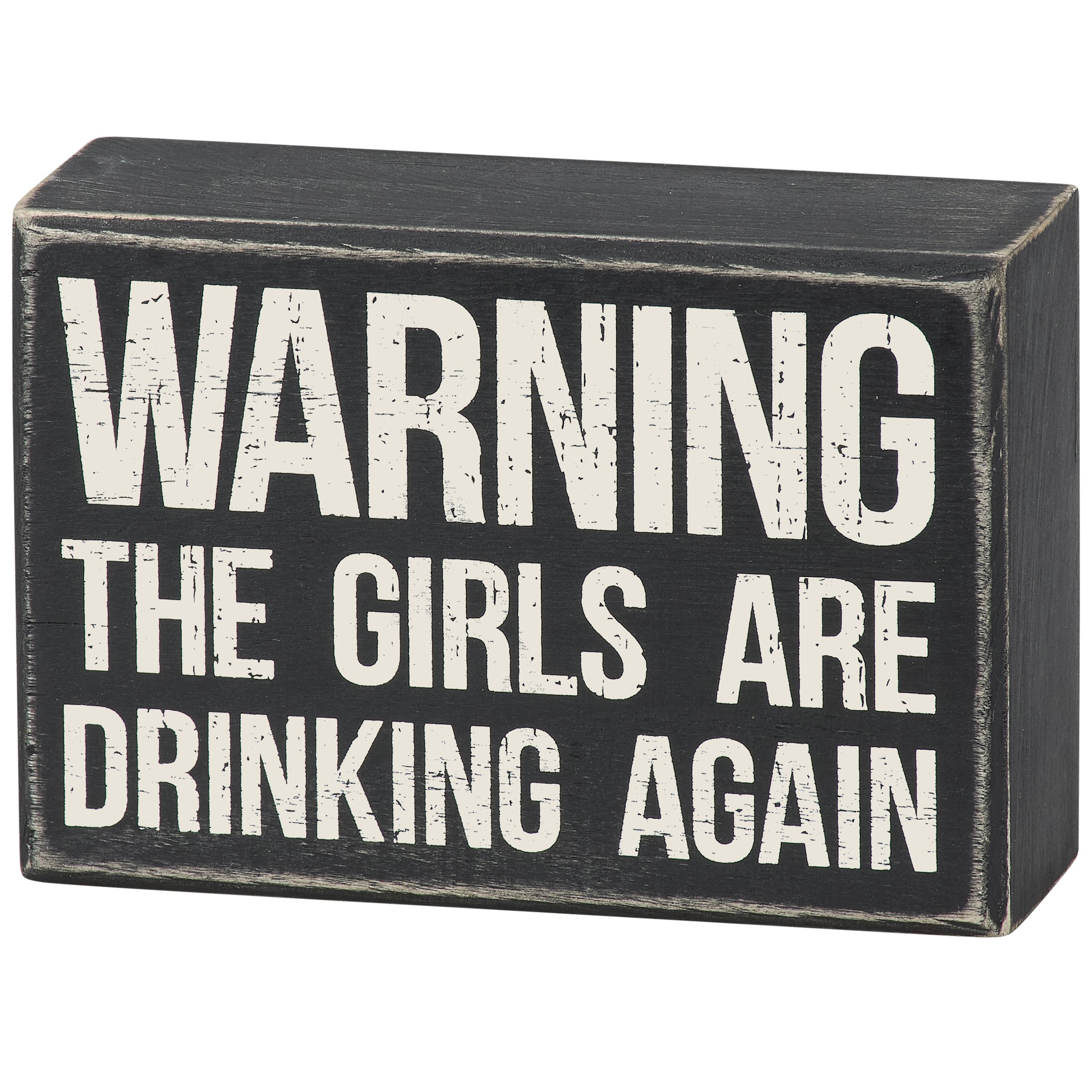 A classic black and white wooden box sign from our Box Sign Style Collection displaying a funny alcohol inspired sentiment that reads "Warning - The Girls Are Drinking Again." This funny alcohol box sign features distressed details with a coordinating black color on sides and back. Our The Girls Are Drinking Again sign is easy to hang or can free-stand on a flat surface for display. A fun alcohol themed home accent that can be easily displayed to add personality to any home or work space.