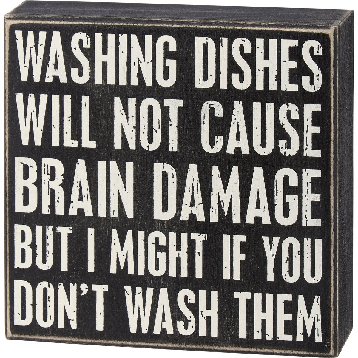 A classic black and white wooden box sign from our Room By Room Collection displaying a humorous sentiment that reads "Washing Dishes Will Not Cause Brain Damage But I Might If You Don't Wash Them." Box sign features distressed details with coordinating black color on sides and back. Our Washing Dishes Brain Damage box sign is easy to hang or can free-stand alone. An everyday home accent with a variety of display options perfect for any kitchen.