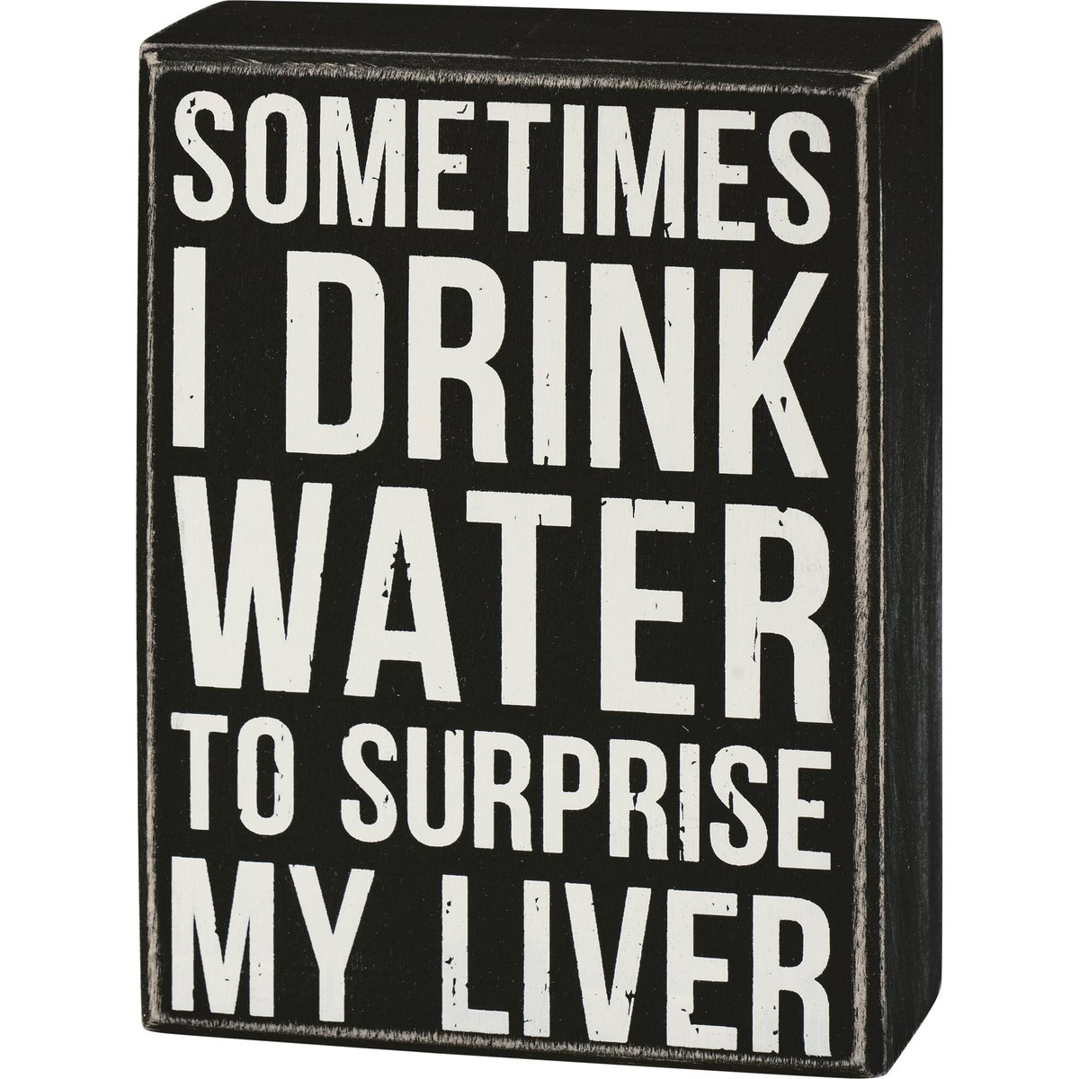 A classic black and white wooden box sign from our Box Signs Collection displaying a humorous sentiment that reads "Sometimes I Drink Water To Surprise My Liver." Box sign features distressed details with coordinating black color on sides and back. Our Water To Surprise My Liver box sign is easy to hang or can free-stand alone. A fun everyday home accent with a variety of display options.