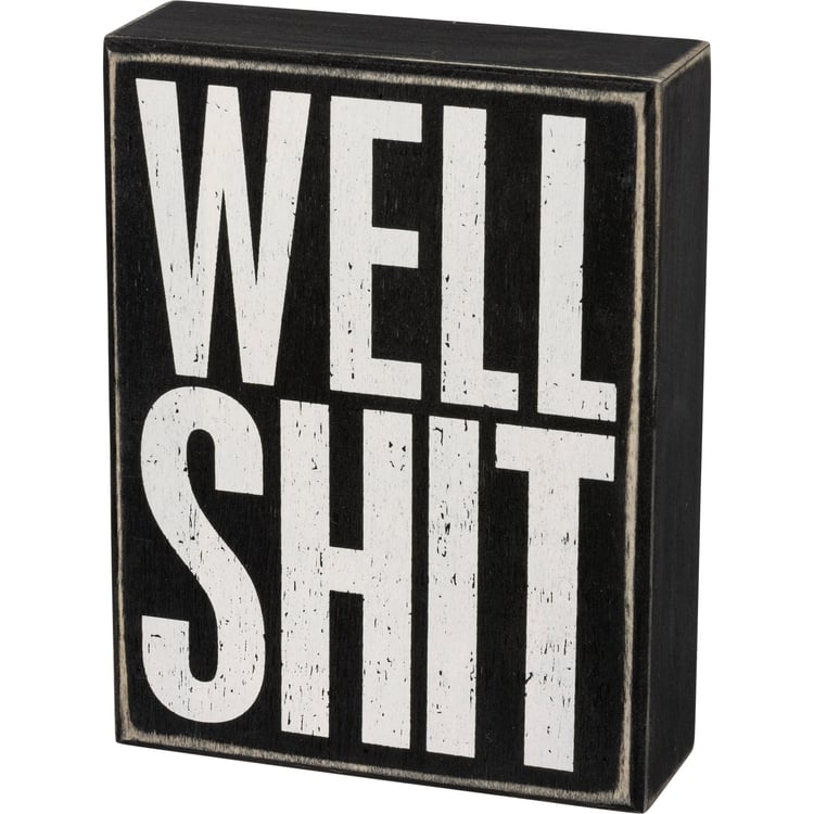 A classic black and white box sign featuring "Well Shit" sentiment. Easy to hang or can free-stand alone.