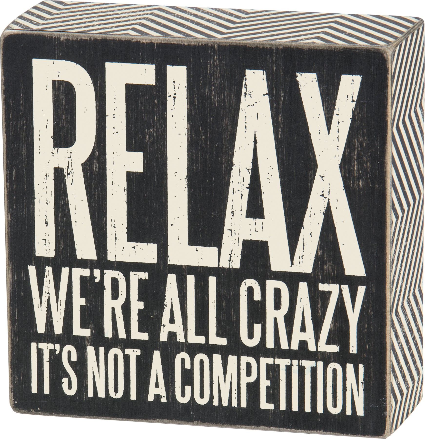 A classic black and white wooden box sign featuring a distressed "Relax - We're All Crazy It's Not A Competition" sentiment with zigzag trim designs. Easy to hang or can free-stand alone.