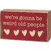 A wooden box sign featuring a rustic hearts design with "We're Gonna Be Weird Old People" sentiment. Easy to hang or can free-stand alone.