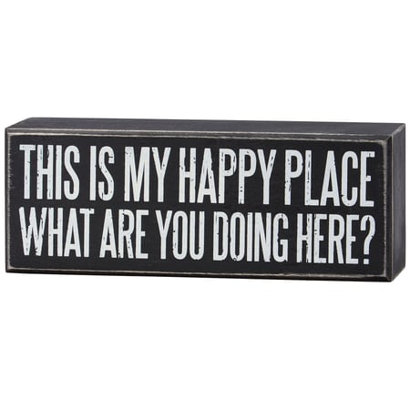 A classic black and white wooden box sign from our Box Sign Collection displaying a sassy sentiment that reads "This Is My Happy Place - What Are You Doing Here?" Funny box sign features distressed details with coordinating black color on sides and back. Our What Are You Doing Here box sign is easy to hang or can free-stand alone. A funny home accent that can be easily displayed in any home or work space.