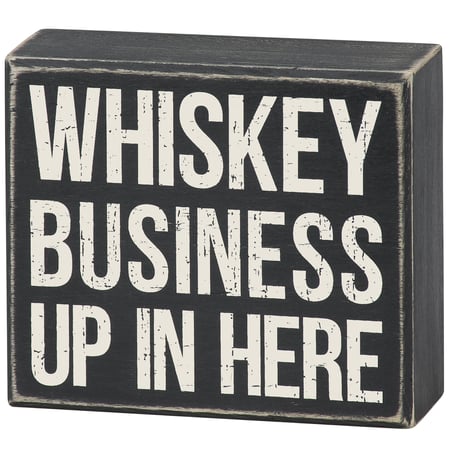 A classic black and white wooden box sign from our Box Sign Style Collection displaying a funny whiskey inspired sentiment that reads "Whiskey Business Up In Here." This funny alcohol box sign features distressed details with a coordinating black color on sides and back. Our Whiskey Business Here sign is easy to hang or can free-stand on a flat surface for display. A fun alcohol themed home accent that can be easily displayed to add personality to any home or work space.