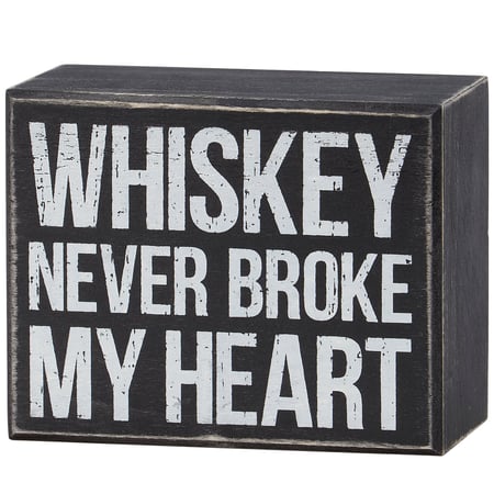 A classic black and white wooden box sign from our Box Sign Collection displaying a sassy alcohol inspired sentiment that reads "Whiskey Never Broke My Heart." Funny box sign features distressed details with coordinating black color on sides and back. Our Whiskey Never Broke My Heart box sign is easy to hang or can free-stand alone. A funny alcohol-themed home accent that can be easily displayed in any home or work space.