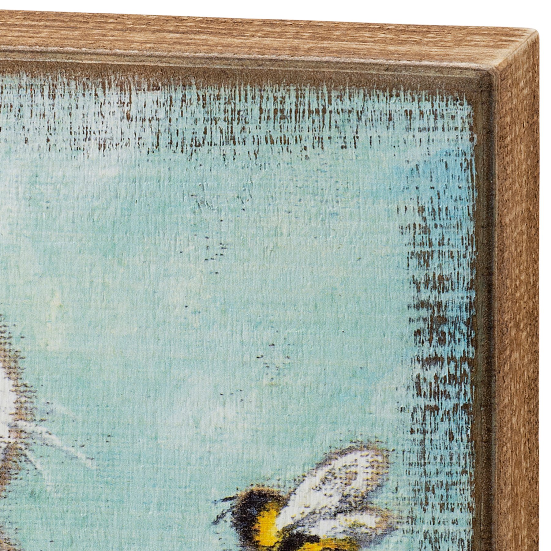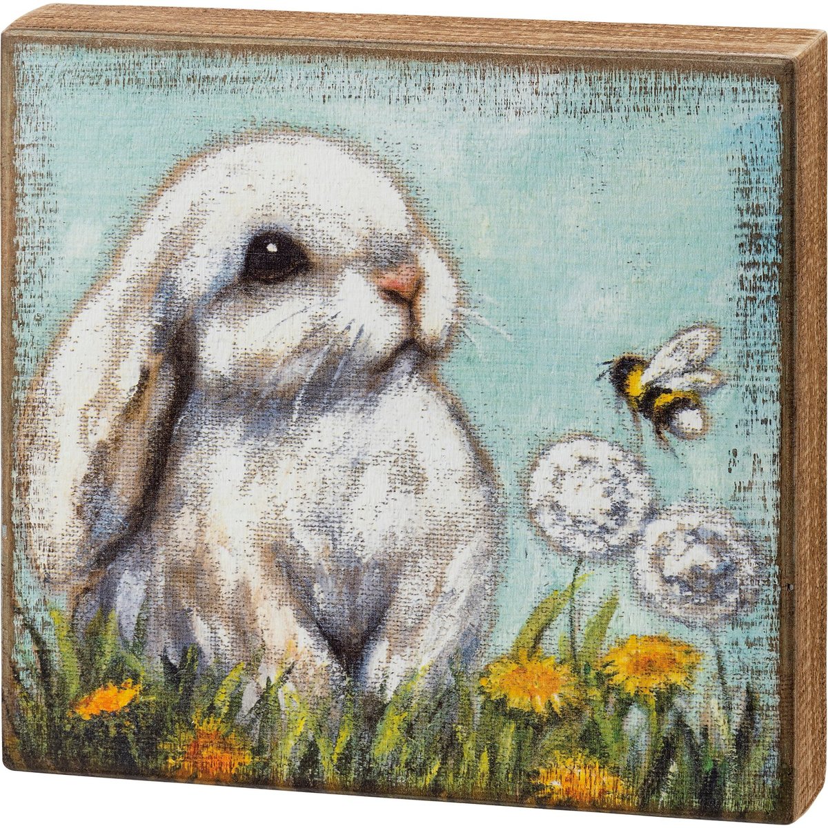 A wooden box sign featuring a white bunny. Design is replicated from original artwork painted directly onto burlap canvas, giving a unique depth and texture to the art. Easy to hang or can free-stand alone.