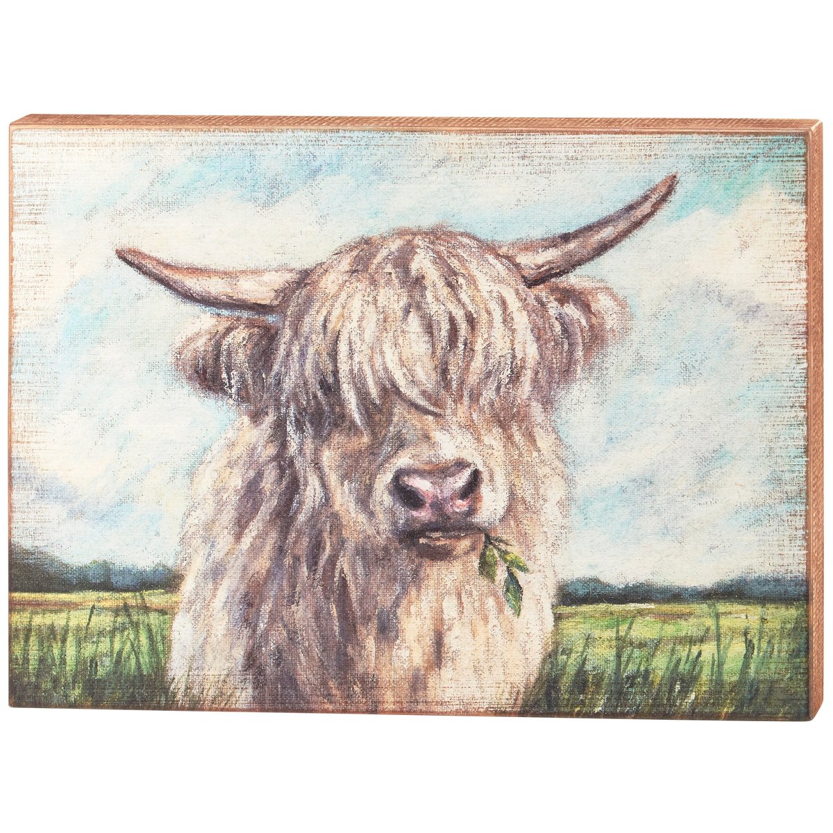 A wooden box sign from our Farmhouse Collection displaying a comforting hand painted design of a white highland cow in a field. Design is replicated from original artwork painted onto burlap canvas, giving the art a unique depth and texture. Box sign features distressed details with coordinating natural wood sides and back. Our White Highland sign is easy to hang or can free-stand alone. A rustic everyday home accent that can be easily displayed in any home or work space.