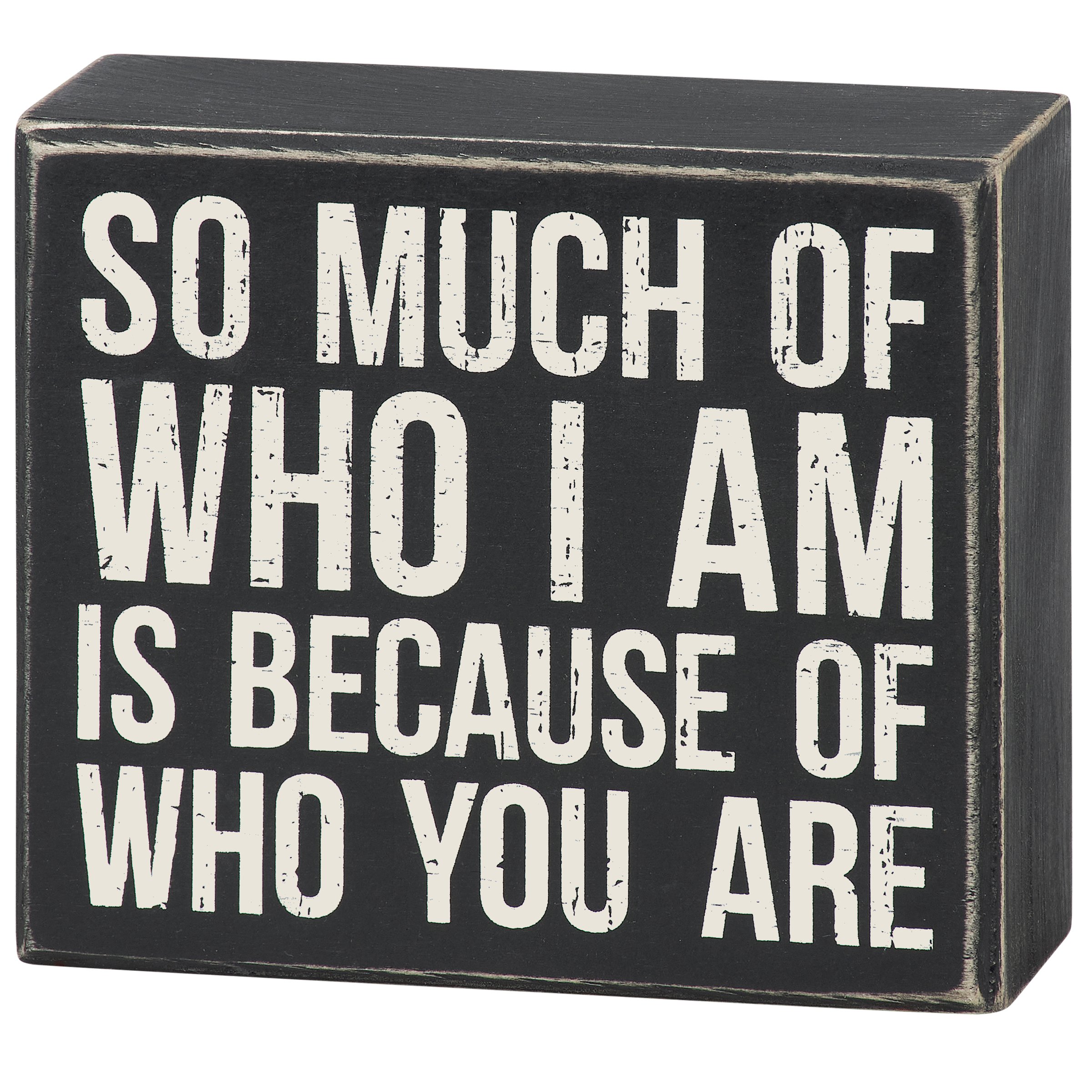 A classic black and white wooden box sign from our Box Sign Style Collection displaying a loving sentiment that reads "So Much Of Who I Am Is Because Of Who You Are." This appreciation box sign features distressed details with a coordinating black color on sides and back. Our Who You Are sign is easy to hang or can free-stand on a flat surface for display. A heartwarming appreciation gift for loved ones that can be easily displayed in any home or work space.