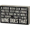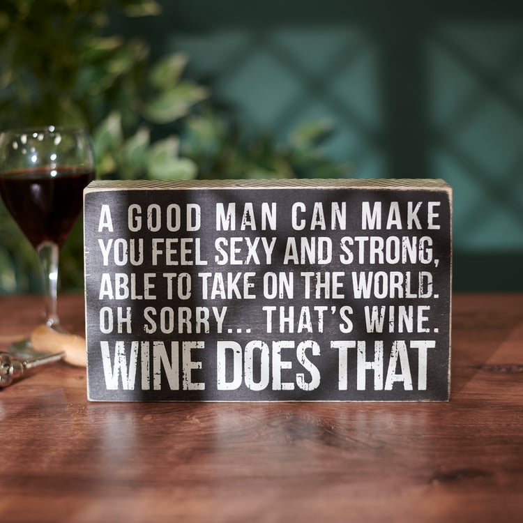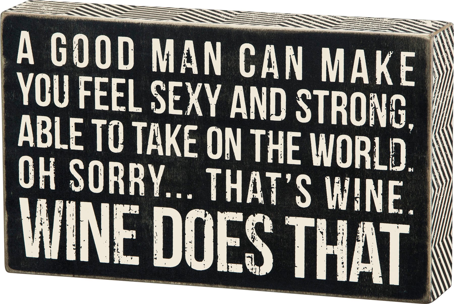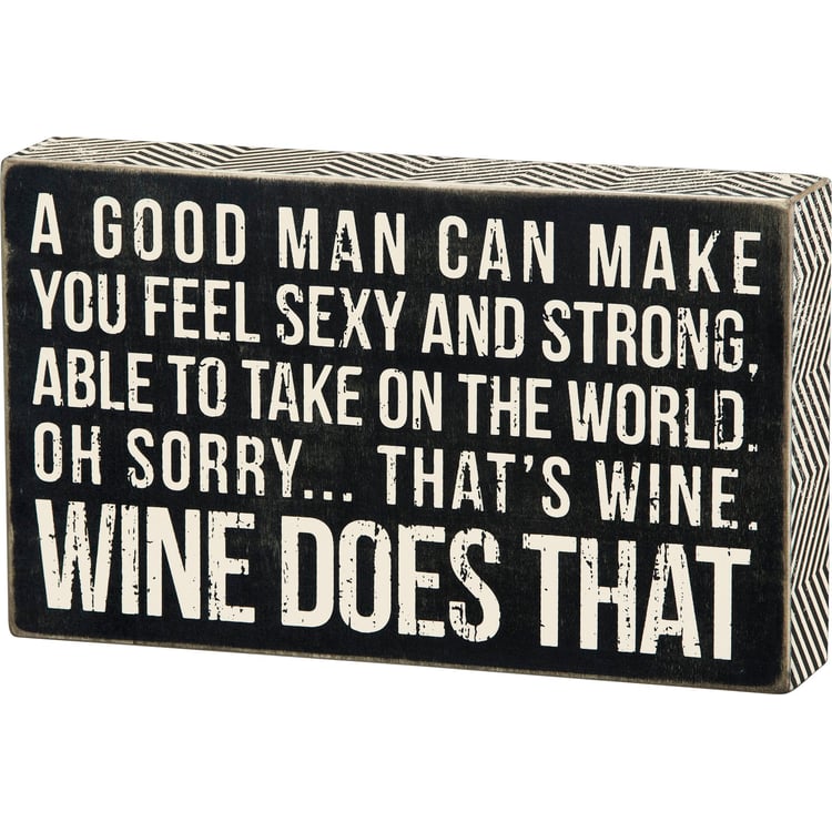 A classic black and white wooden box sign featuring distressed "A Good Man Can Make You Feel Sexy And Strong, Able To Take On The World. Oh Sorry… That's Wine. Wine Does That" sentiment and zigzag patterned trim. Easy to hang or can free-stand alone.