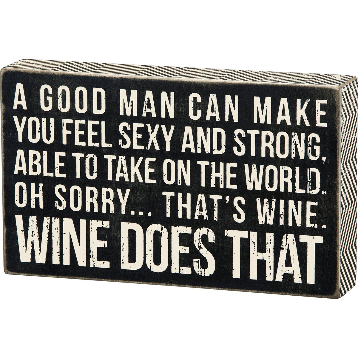 A classic black and white wooden box sign featuring distressed "A Good Man Can Make You Feel Sexy And Strong, Able To Take On The World. Oh Sorry… That's Wine. Wine Does That" sentiment and zigzag patterned trim. Easy to hang or can free-stand alone.