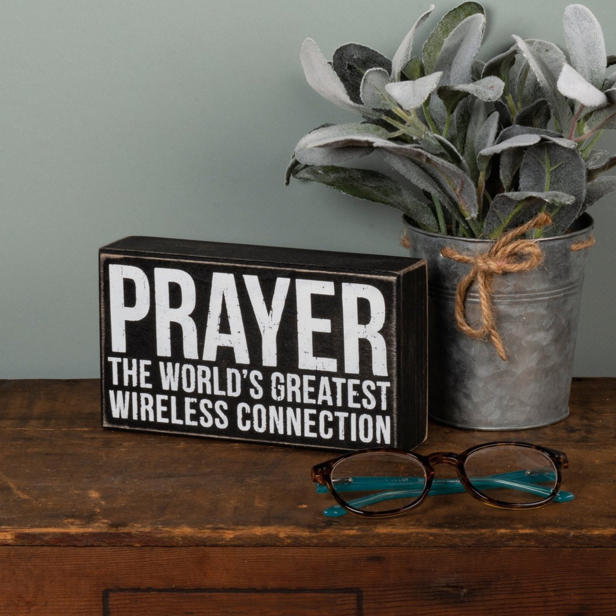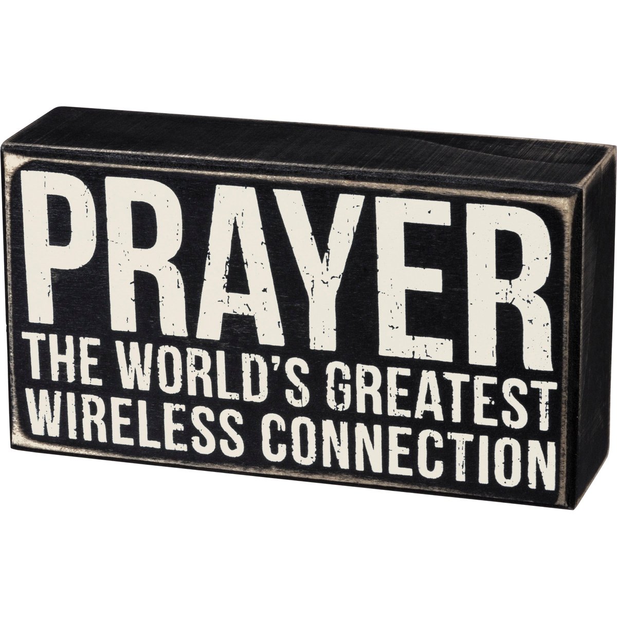 A classic black and white wooden box sign featuring a distressed "Prayer - The World's Greatest Wireless Connection" sentiment. Easy to hang or can free-stand alone.