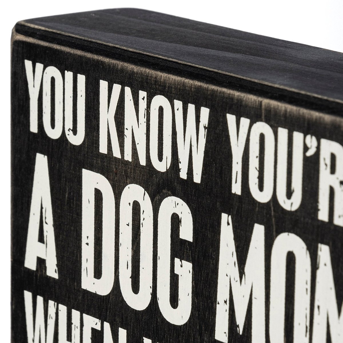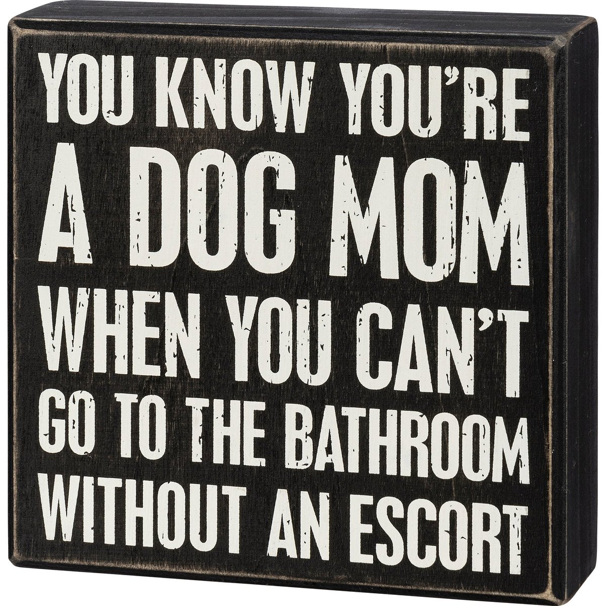 A classic black and white wooden box sign featuring a distressed "You Know You're A Dog Mom When You Can't Go To The Bathroom Without An Escort" sentiment. Easy to hang or can free-stand alone.