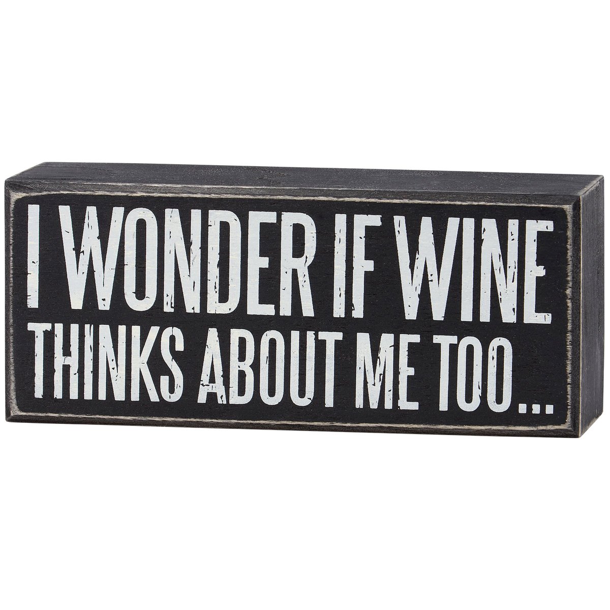 A classic black and white wooden box sign from our Box Sign Collection displaying a fun wine inspired sentiment that reads "I Wonder If Wine Thinks About Me Too..." Funny box sign features distressed details with coordinating black color on sides and back. Our Wonder If Wine Thinks box sign is easy to hang or can free-stand alone. A funny wine-themed home accent that can be easily displayed in any home or work space.