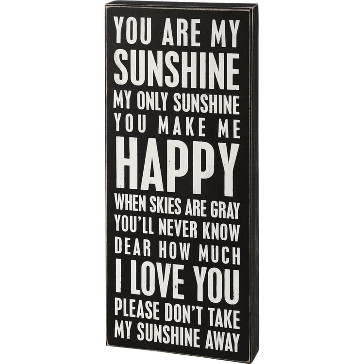 A classic black and white wooden box sign featuring a distressed "You Are My Sunshine - My Only Sunshine - You Make Me Happy When Skies Are Gray - You'll Never Know Dear How Much I Love You - Please Don't Take My Sunshine Away" sentiment. Easy to hang or can free-stand alone.