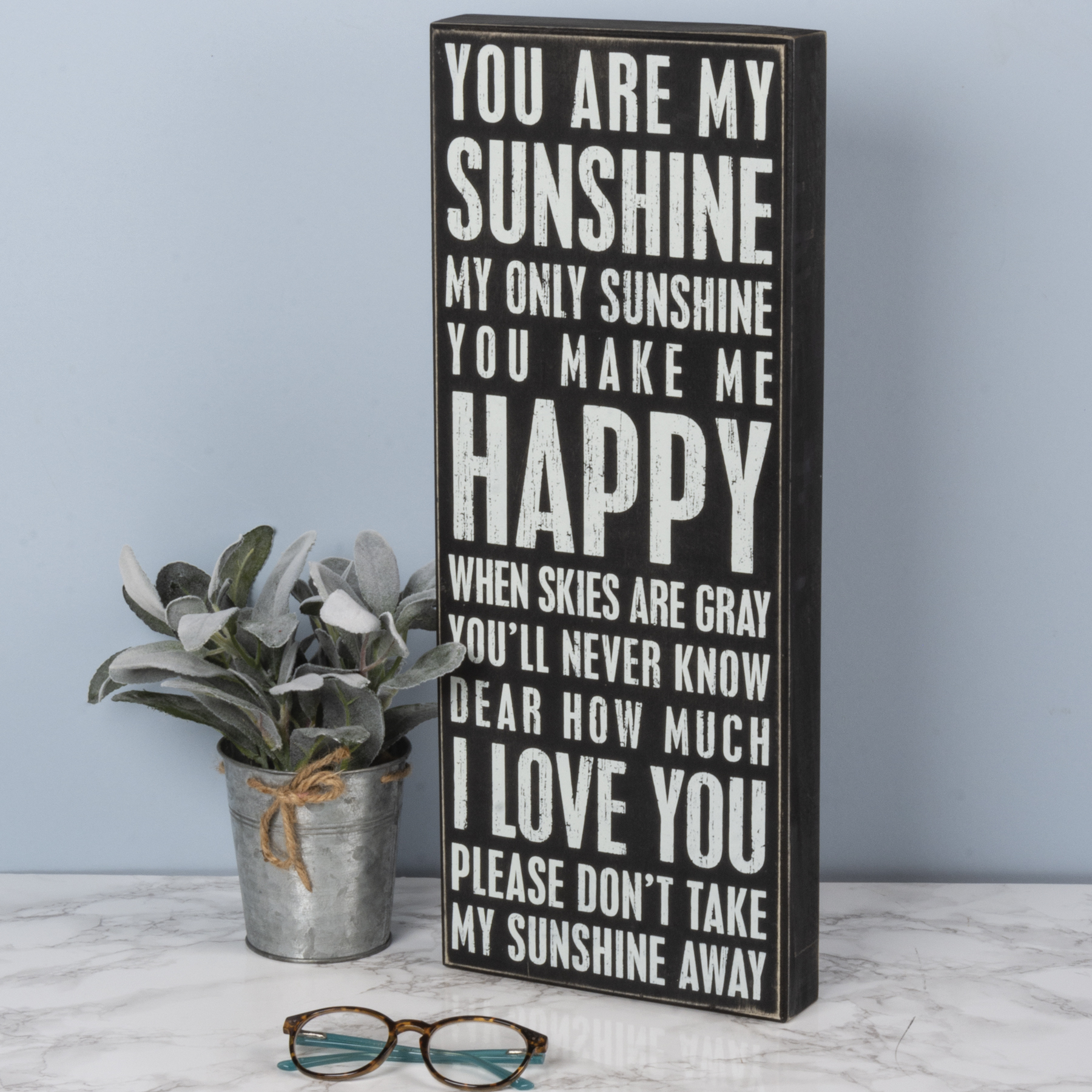 A classic black and white wooden box sign featuring a distressed "You Are My Sunshine - My Only Sunshine - You Make Me Happy When Skies Are Gray - You'll Never Know Dear How Much I Love You - Please Don't Take My Sunshine Away" sentiment. Easy to hang or can free-stand alone.