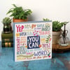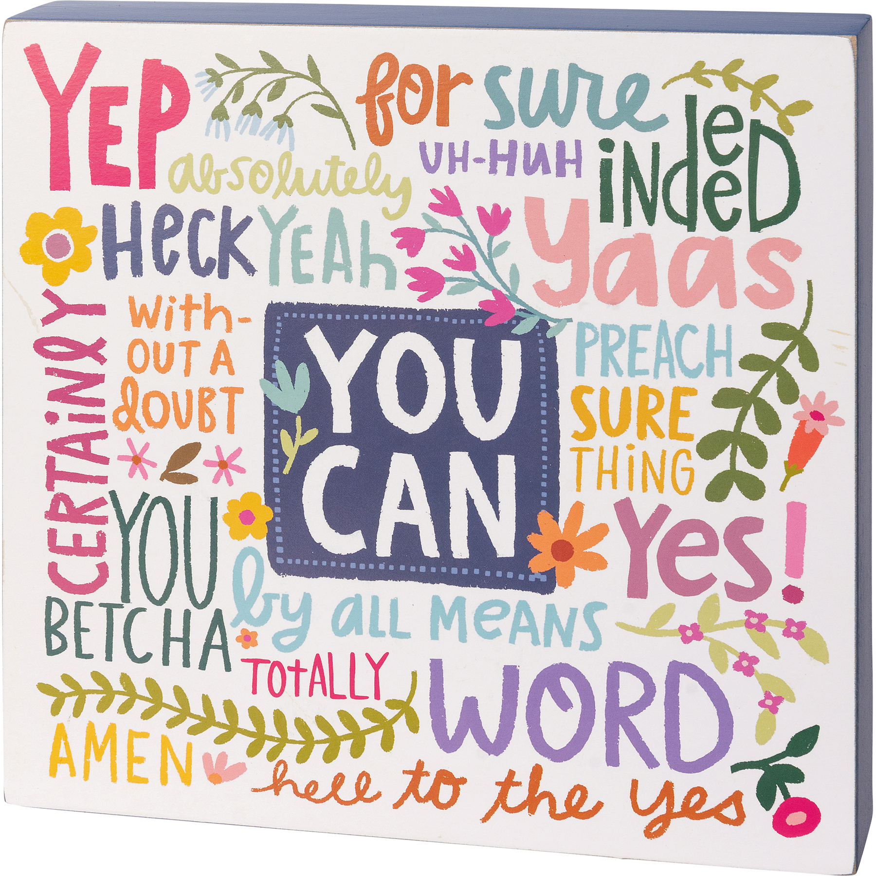 A wooden box sign from our Inspiration & Blooms Collection features an inspirational "You Can" sentiment with vibrant, whimsical designs and other inspirational words. Sides feature coordinating color for added interest. Our You Can box sign is easy to hang or can free-stand alone.