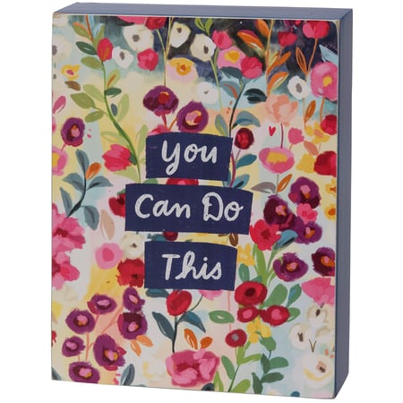 A colorful wooden box sign from our Inspiration & Blooms Collection displaying vibrant hand illustrated florals surrounding an inspirational sentiment that reads "You Can Do This." This inspirational box sign features coordinating blue color on the sides and back. Our You Can Do This sign is easy to hang or can free-stand on a flat surface for display. An inspirational gift that can be easily displayed in any home or work space. Not eligible for discounting.