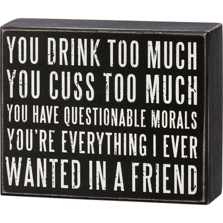 A classic black and white box sign from our Box Sign Collection features a distressed "You Drink Too Much You Cuss Too Much You Have Questionable Morals You're Everything I Ever Wanted In A Friend" sentiment. Our You Drink Too Much box sign is easy to hang or can free-stand alone.
