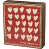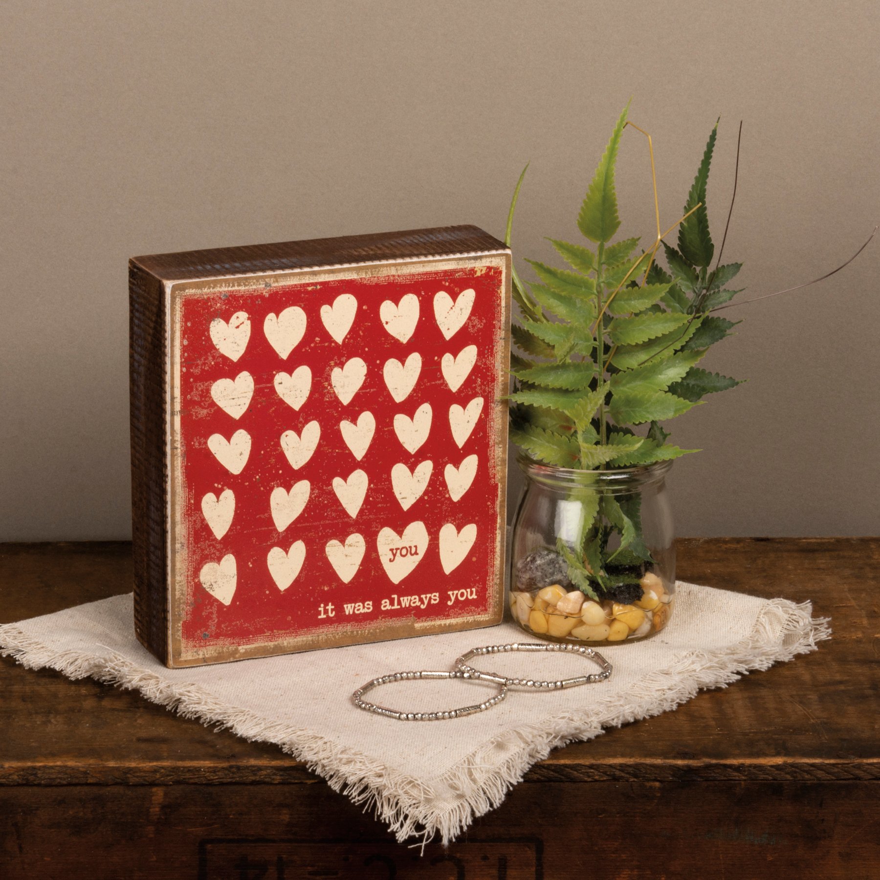 A rustic-inspired wooden box sign lending a distressed "You - It Was Always You" sentiment with patterned hearts design. Complements well with existing decor and is easy to hang as a gallery wall accent or can free-stand alone on a mantel, desk, or shelf.