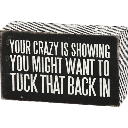 A classic black and white wooden box sign featuring a distressed "Your Crazy Is Showing - You Might Want To Tuck That Back In" sentiment with zigzag trim designs. Easy to hang or can free-stand alone.