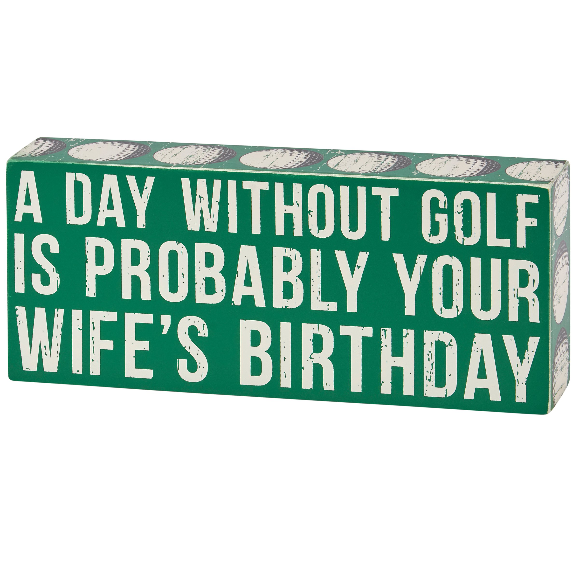 A wooden box sign from our Sports Collection displaying a fun golf inspired sentiment in a classic box sign style that reads "A Day Without Golf Is Probably Your Wife's Birthday." Funny golf box sign features coordinating green color with golf ball pattern along the sides. Our Your Wife's Birthday box sign is easy to hang or can free-stand alone. A fun golf-themed gift that can be easily displayed in any home or work space.