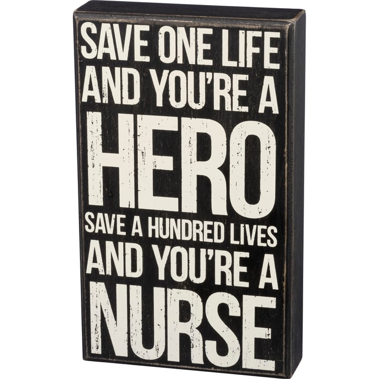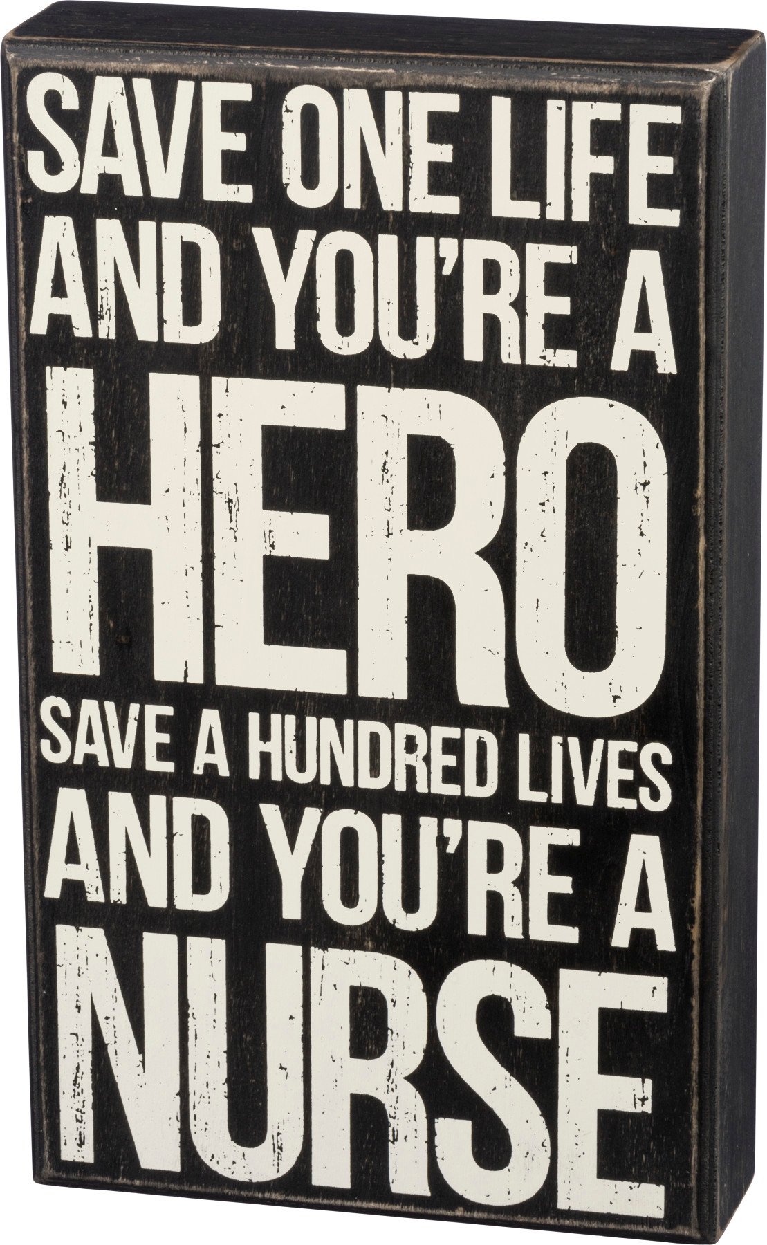 Celebrate healthcare workers with this easy to hang box sign from our Nurse Collection displaying a classic black and white box sign style with distressed details and sentiment that reads "Save One Life And You're A Hero - Save A Hundred Lives And You're A Nurse." Box sign features coordinating black color on sides. Our You're A Nurse box sign is easy to hang or can free-stand alone.