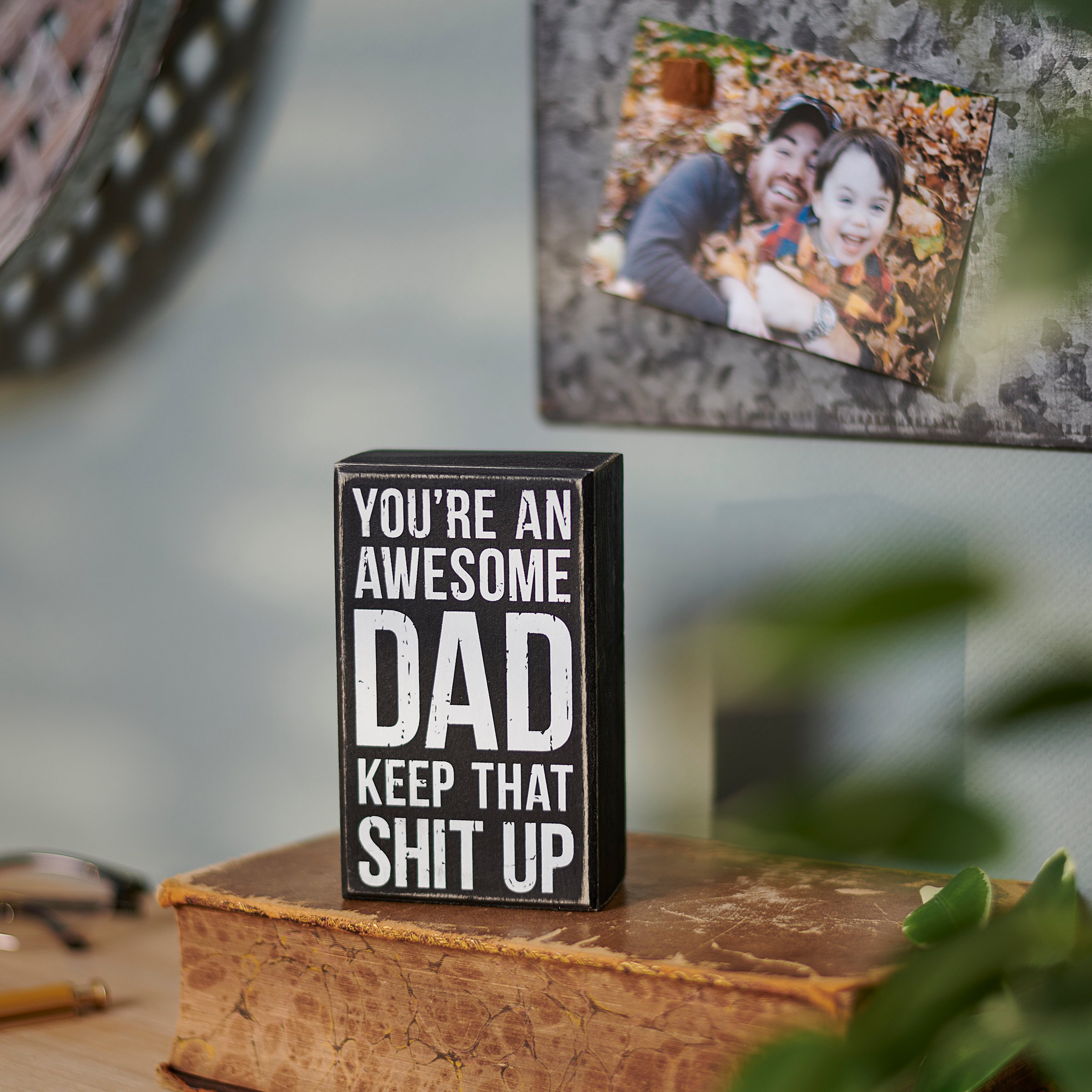 A classic black and white wooden box sign from our Father's Day Collection displaying a distressed "You're An Awesome Dad Keep That Shit Up" sentiment. Our You're An Awesome Dad box sign is easy to hang or can free-stand alone.