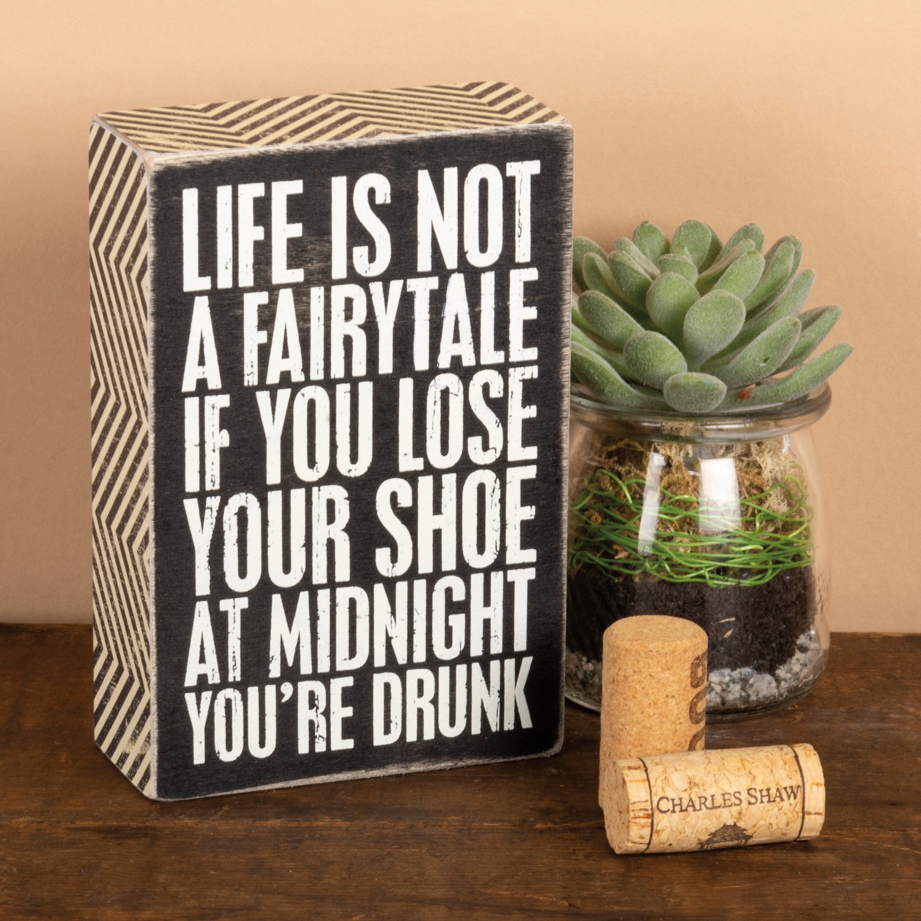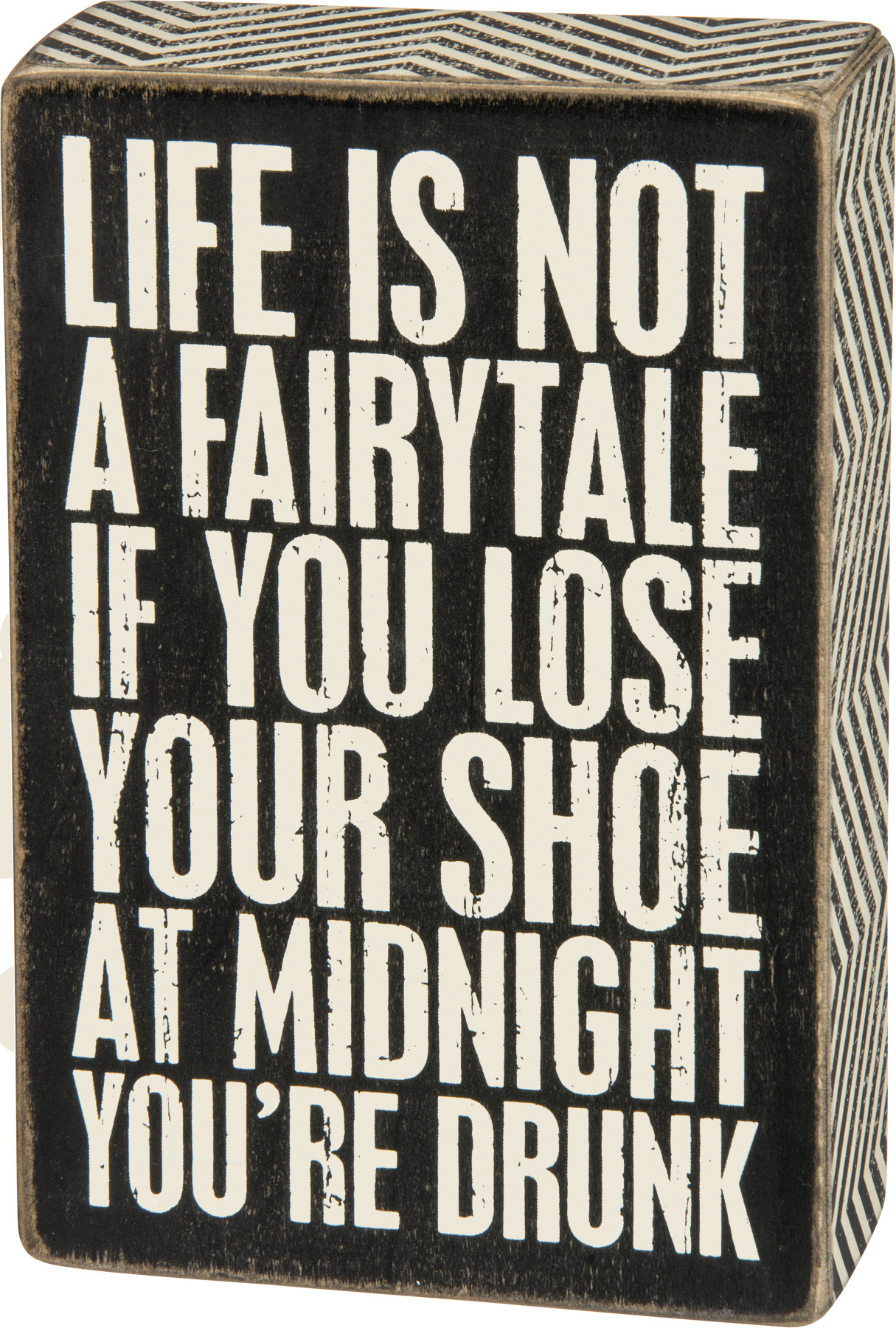 A classic black and white wooden box sign lending a distressed "Life Is Not A Fairytale - If You Lose Your Shoe At Midnight You're Drunk" sentiment with zigzag patterned trim. Easy to hang or can free-stand alone.