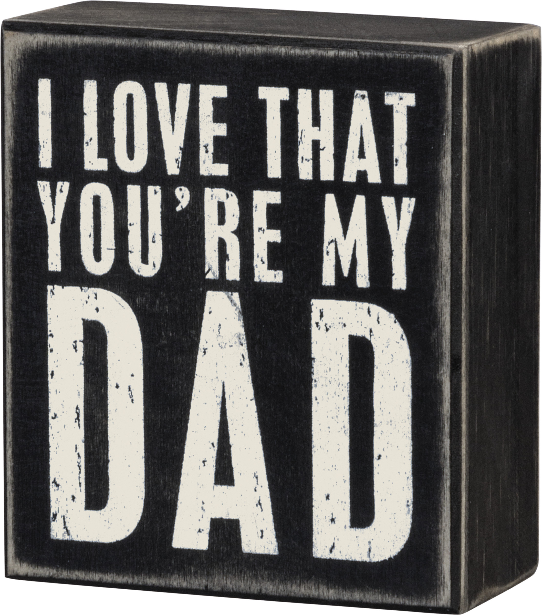 A classic black and white wooden box sign featuring a distressed "I Love That You're My Dad" sentiment. Easy to hang or can free-stand alone.