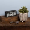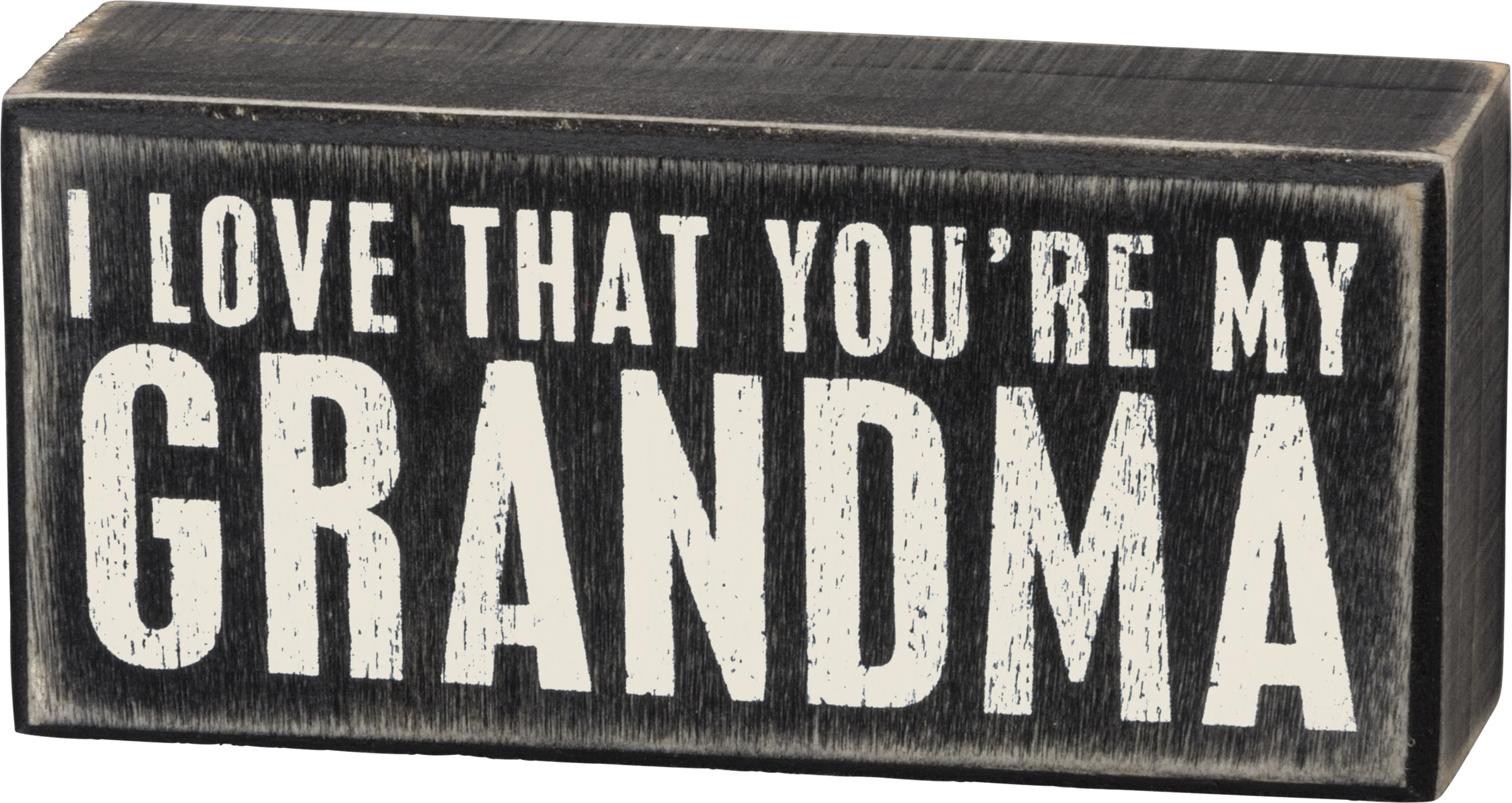 A classic black and white wooden box sign featuring a distressed "I Love That You're My Grandma" sentiment. Easy to hang or can free-stand alone.