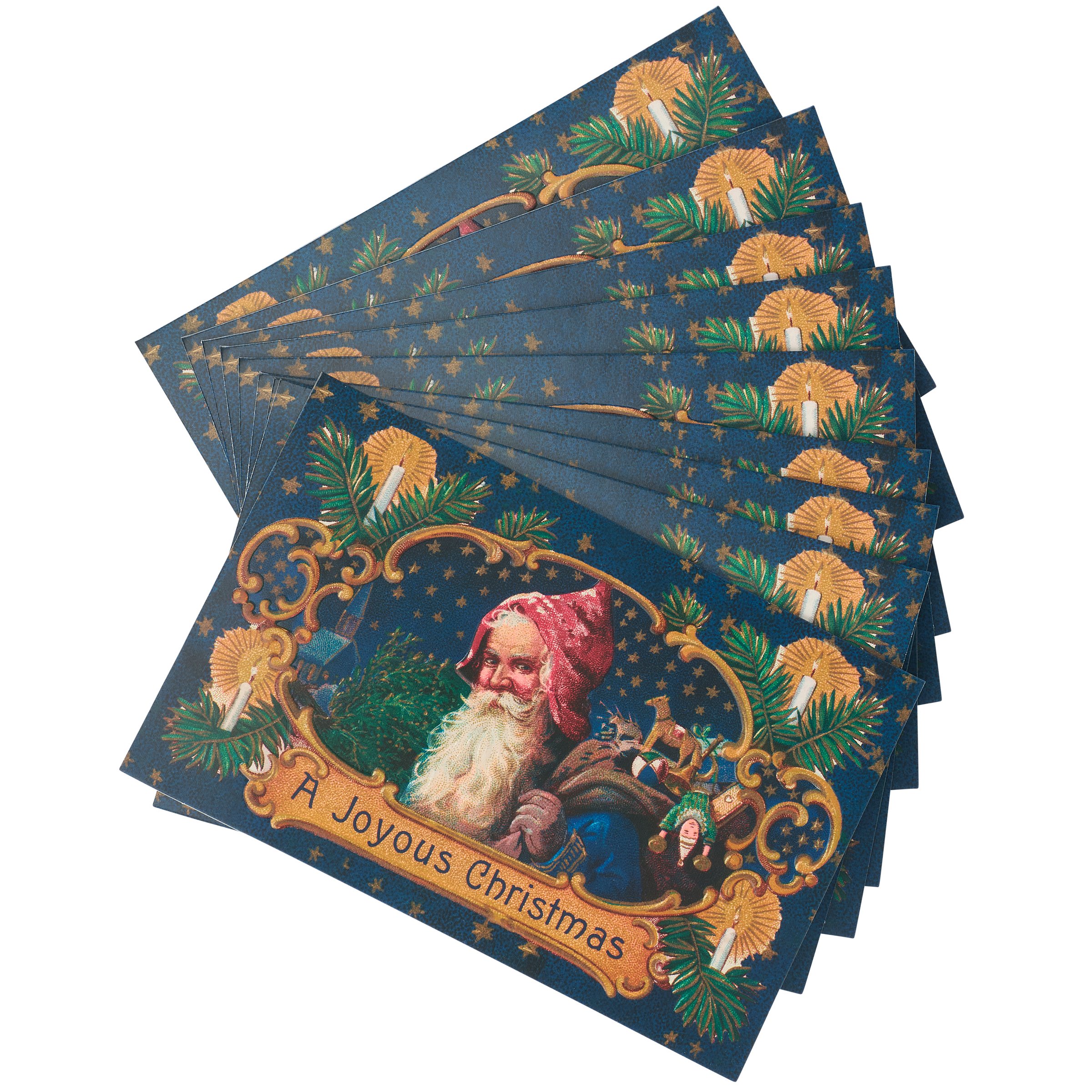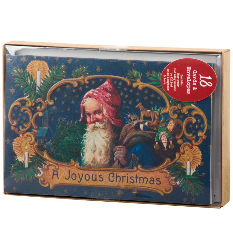 A Christmas card set from our Christmas Collection displaying vintage art of Santa delivering presents under a starry night sky and "A Joyous Christmas" sentiment on each card as well as a holiday sentiment on the inside that reads "May Your Holiday Season Be Filled With Laughter & Love" with space to write a personal message. Christmas card design also features embossed details for added quality. Our A Joyous Christmas card box includes 18 cards and envelopes packaged inside a box with acrylic lid to view card design for easy store display. A vintage Christmas card set perfect for seasonal moments.