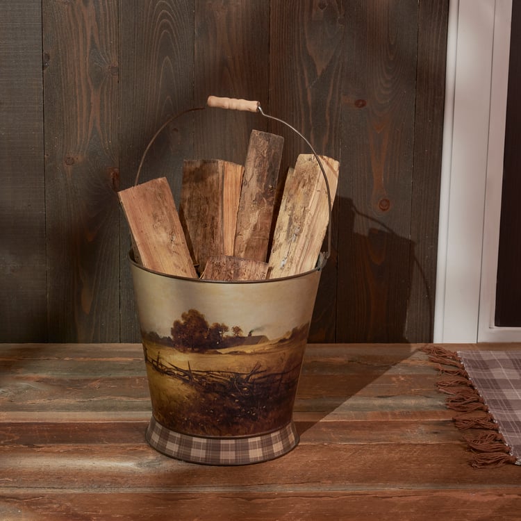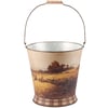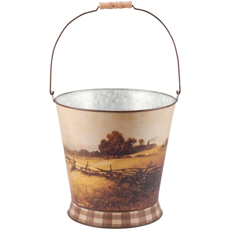 A galvanized metal bucket from our Fall & Harvest Collection displaying a full wrap-around design of a rural farmland scene inspired by Old World home décor. Base of bucket also displays a complementing fall inspired plaid. Bucket is perfect for displaying seasonal décor or storing household items in style. Accessories pictured not included. Our Rural Farmland bucket includes a metal handle with wooden grip for easy carrying. A rustic home accent with a variety of display options.