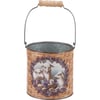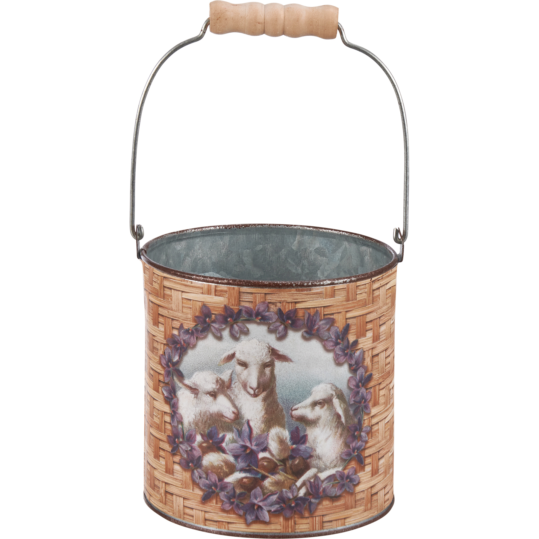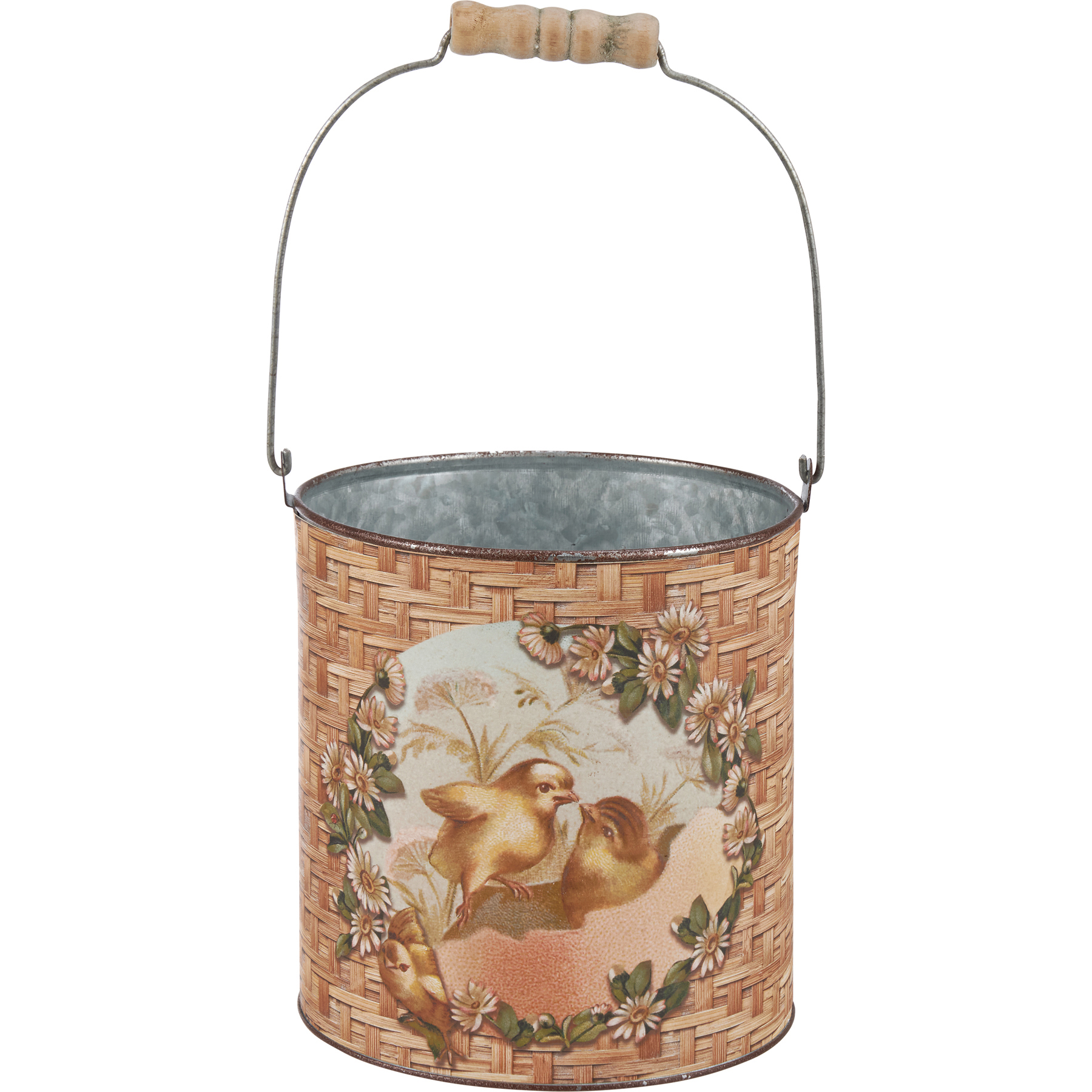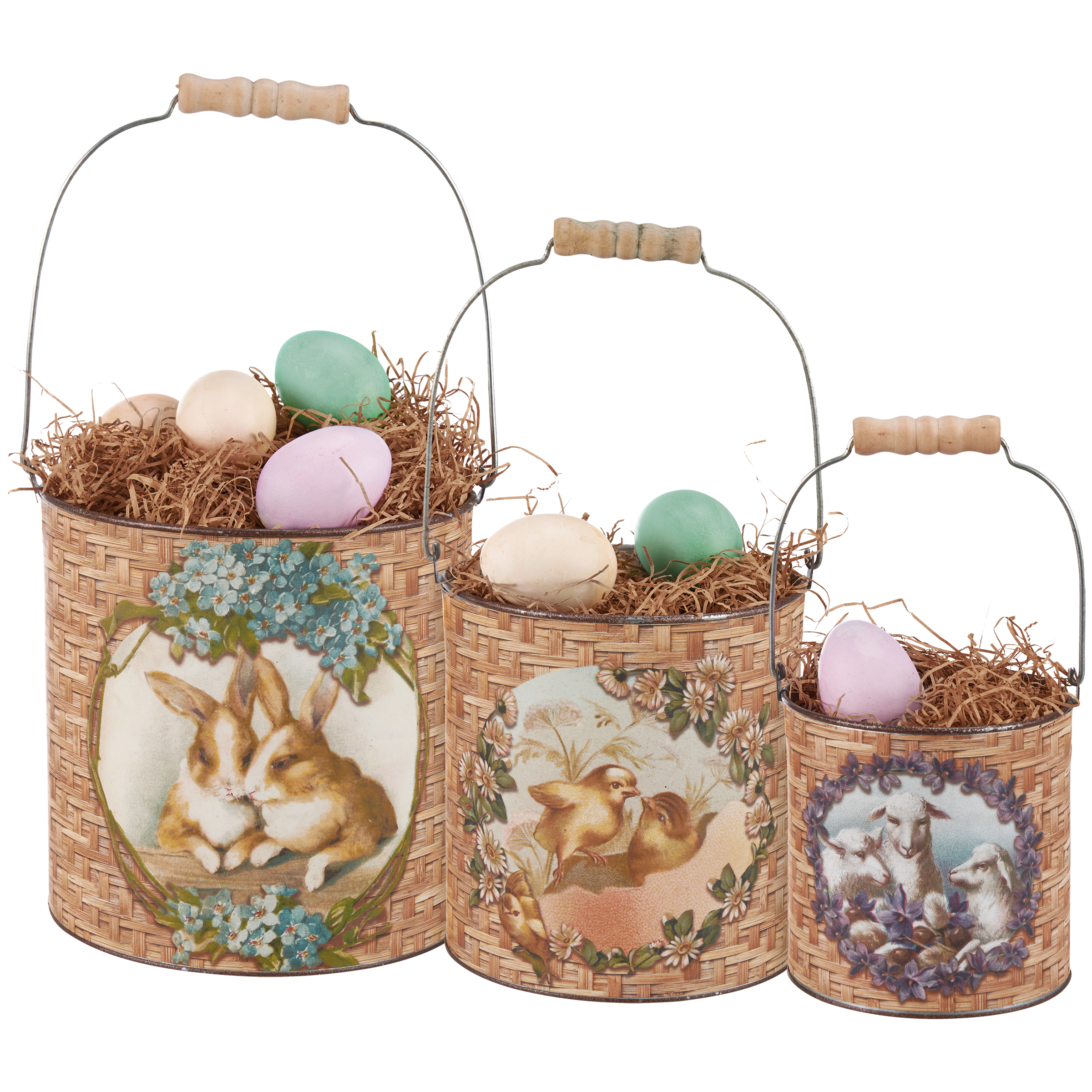 A set of three metal buckets in varying size from our Easter & Spring Collection displaying unique vintage animal designs on each surrounded by soft florals. Bucket designs feature wrap-around basket weave pattern behind each design. Large bucket displays two bunnies, medium bucket displays chicks, and small bucket displays lambs. Perfect as part of an Easter display or for storing small objects. Our Bunny And Friends bucket set includes metal handles with wooden grip for easy carrying. Accessories not included.