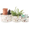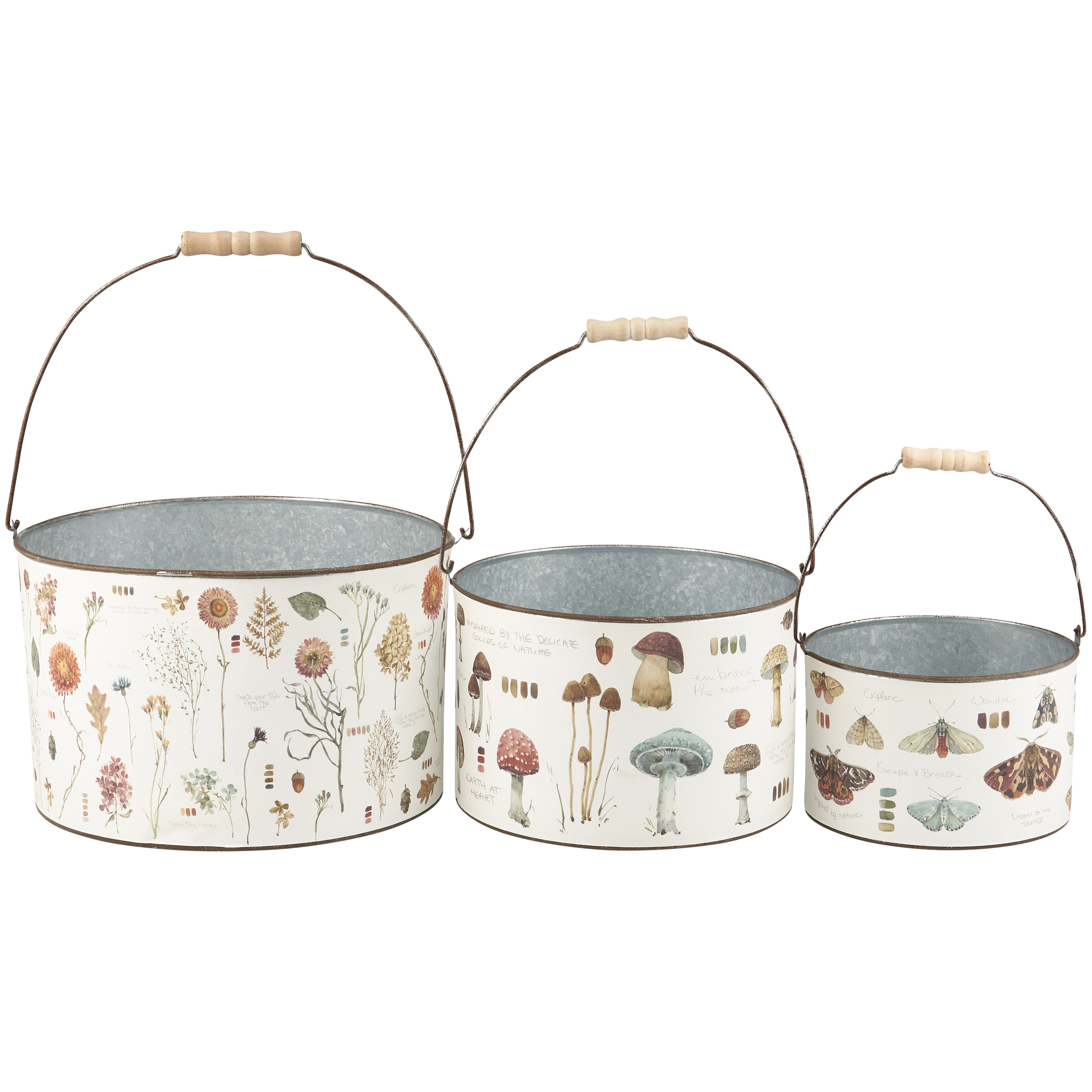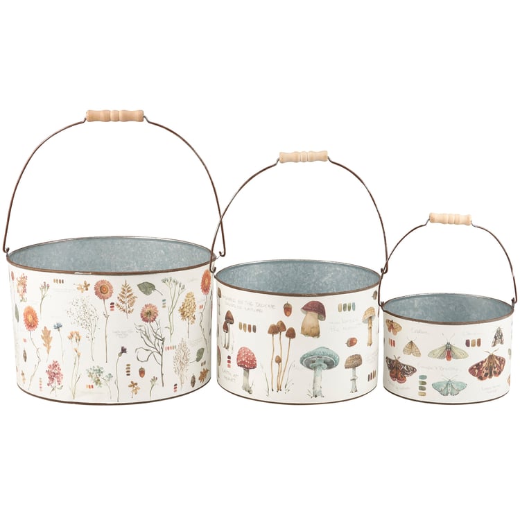 A set of three galvanized metal buckets in different sizes from ourĀ Fall & Harvest Collection. Each bucketĀ features individual full wrap-around designs displaying various elements of autumn florals and nature with accents of study notes. Seasonal bucket designs are replicated from original artwork hand painted in a delicate watercolor style. Bucket set is perfect for displaying seasonal greenery or storing household items in style. Accessories and greenery pictured not included. Our Floral Study bucket set includes metal handles with wooden grips for easy carrying and stack inside each other for compact storage. A rustic set of seasonal home accents with a variety of display options.