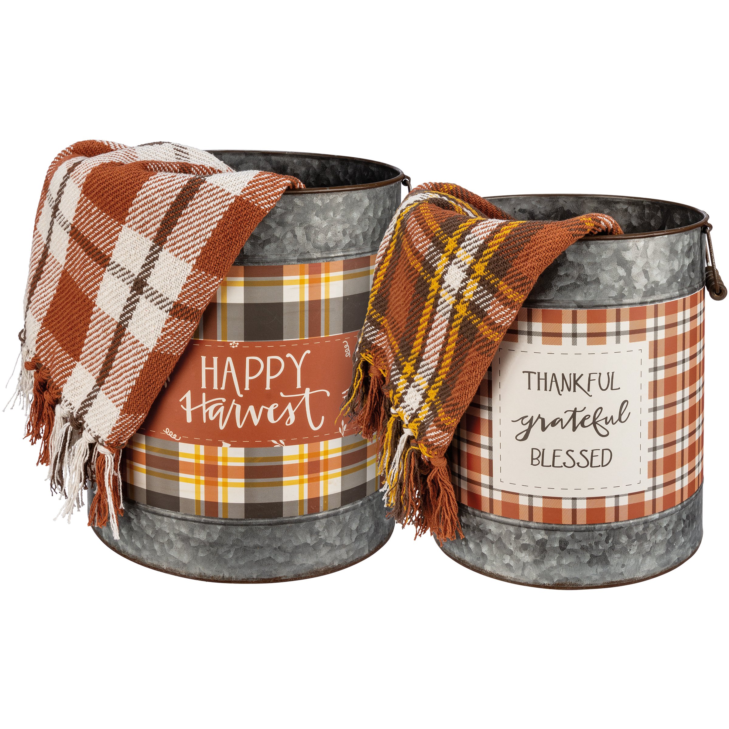 A set of two galvanized metal buckets with metal handles and wooden grips. Buckets have design bands with autumnal plaid patterns. Large bucket features "Happy Harvest" sentiment and small bucket features "Thankful Grateful Blessed" sentiment.