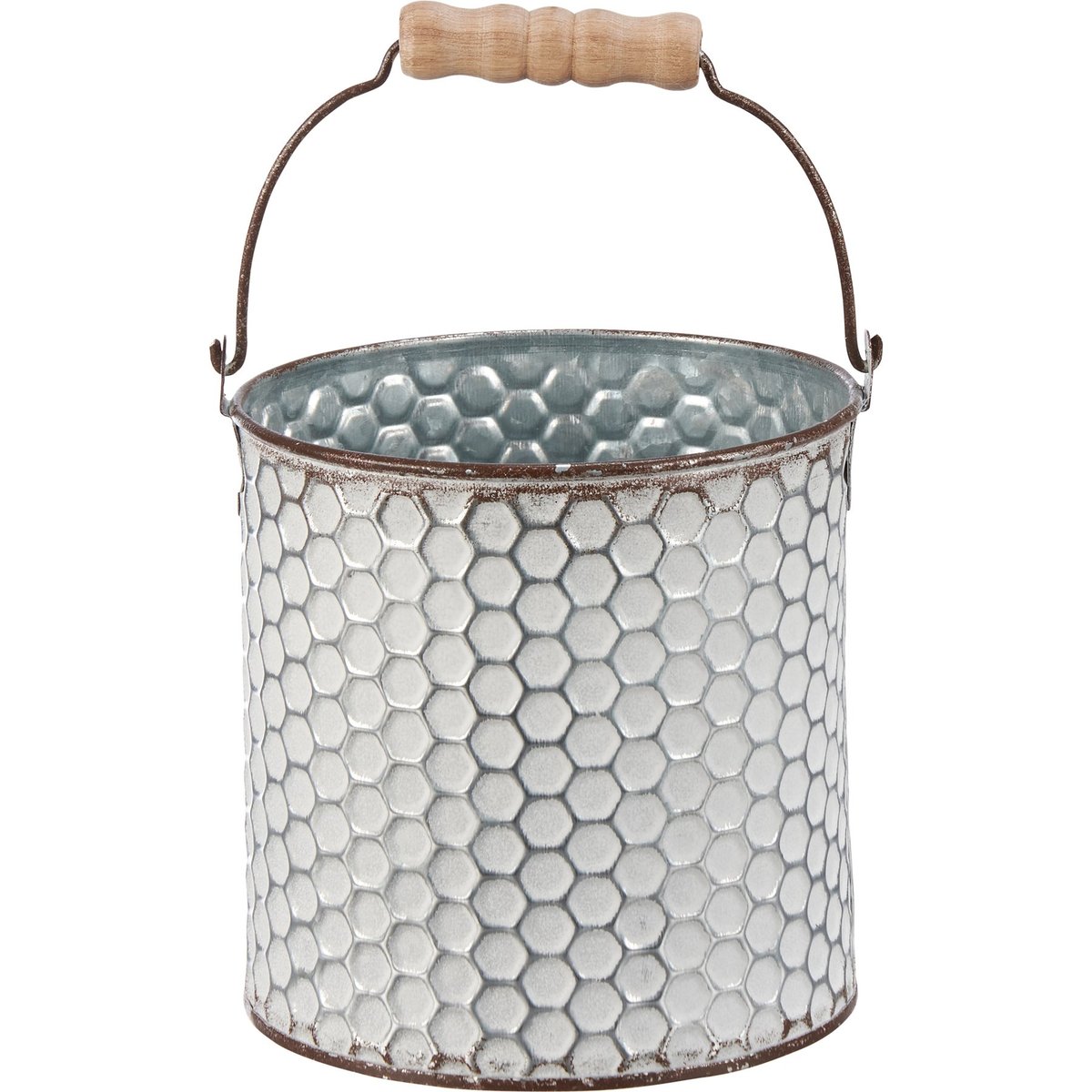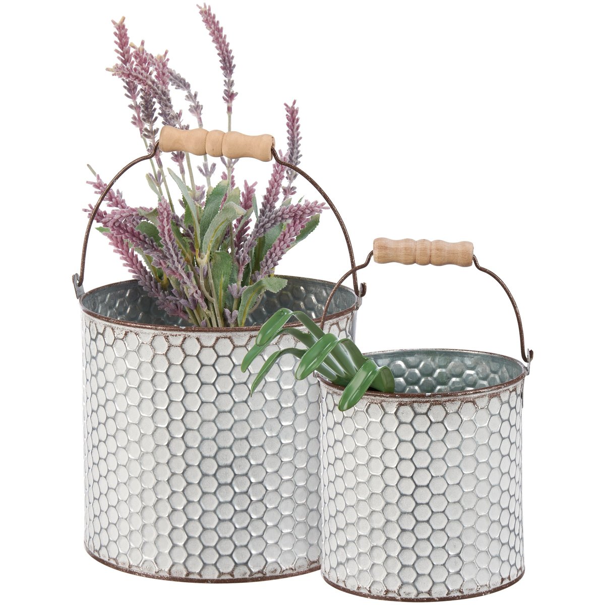 A set of two metal buckets in varying size from our Bee Collection displaying wrap-around debossed honeycomb designs on each. Bucket designs feature galvanized metal with wash of white paint for added texture. Perfect for storing gardening tools, greenery, or other small objects. Our Honeycomb bucket set includes metal handles with wooden grip for easy carrying. Accessories not included.