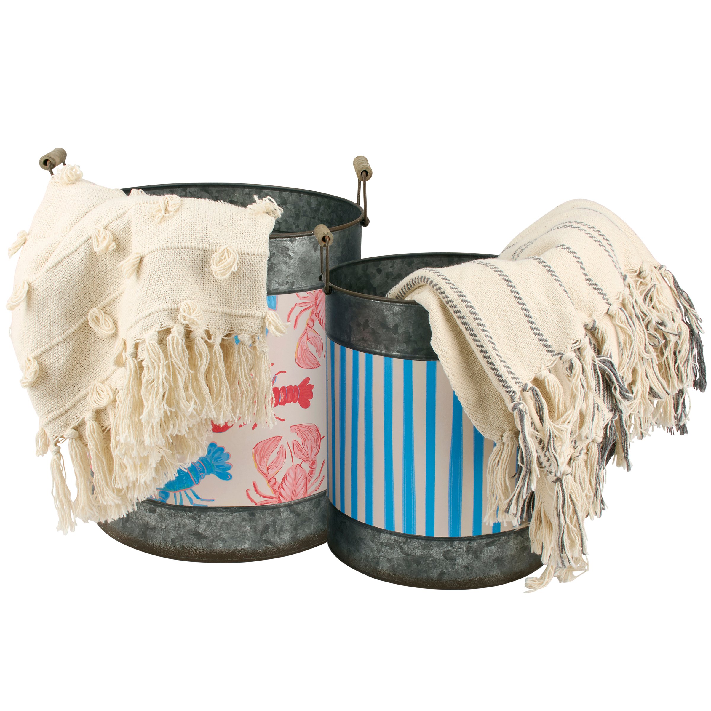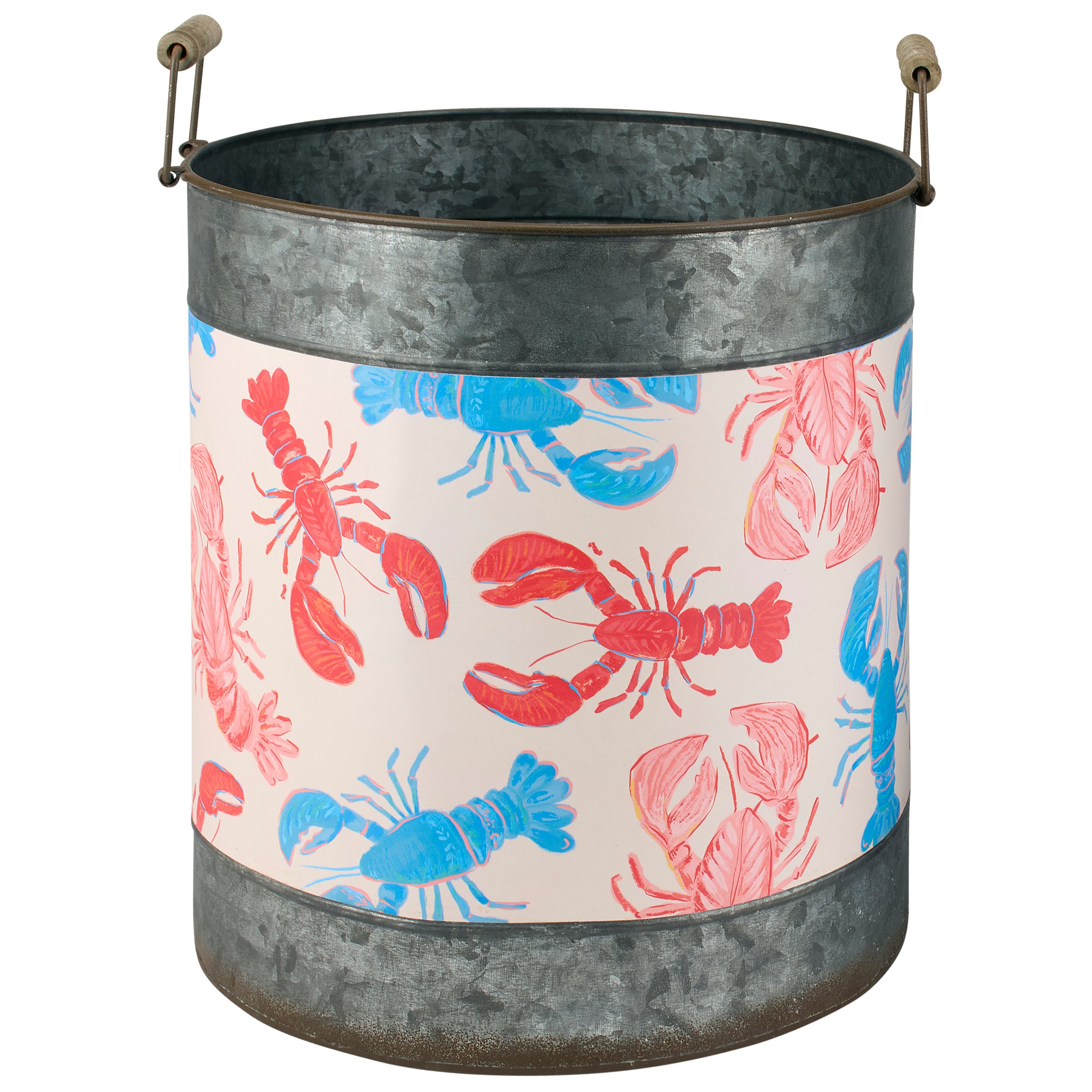 A set of 2 metal buckets in different sizes from our Beach Collection featuring individual full wrap-around designs inspired by Italian coastal style. Beach bucket designs include a pattern of lobsters on the larger bucket and a coordinating stripe pattern on the smaller bucket. Italian coastal designs are replicated from original art hand painted in a unique watercolor style. Accessories pictured not included. Our Lobsters bucket set includes metal handles with wooden grips for easy carrying and they nest inside each other for compact storage. A set of beach themed home accents with a variety of display options.