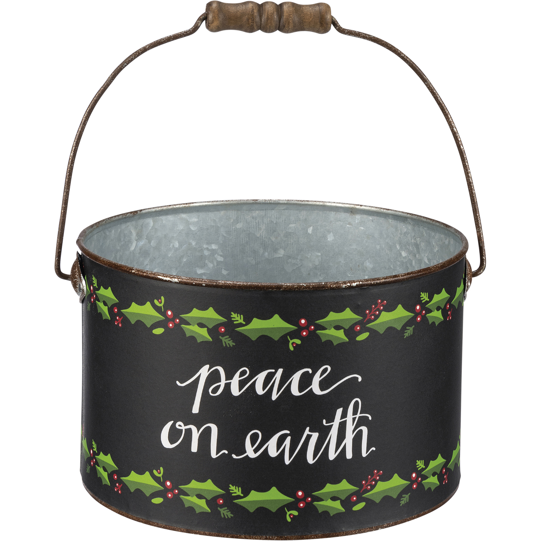 A set of two galvanized metal buckets with metal handles and wooden grips. Buckets have design bands featuring a moody palette with holly leaf patterns and hand lettered sentiments . Large bucket features "Merry Christmas" sentiment and small bucket features "Peace On Earth" sentiment.