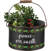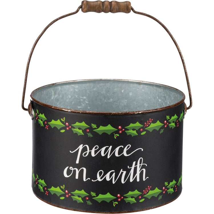 A set of two galvanized metal buckets with metal handles and wooden grips. Buckets have design bands featuring a moody palette with holly leaf patterns and hand lettered sentiments . Large bucket features "Merry Christmas" sentiment and small bucket features "Peace On Earth" sentiment.