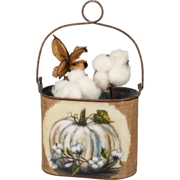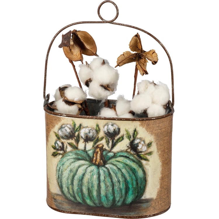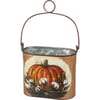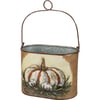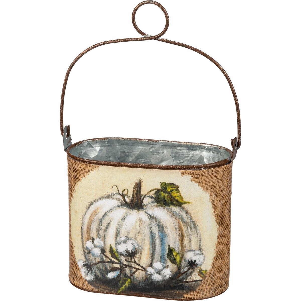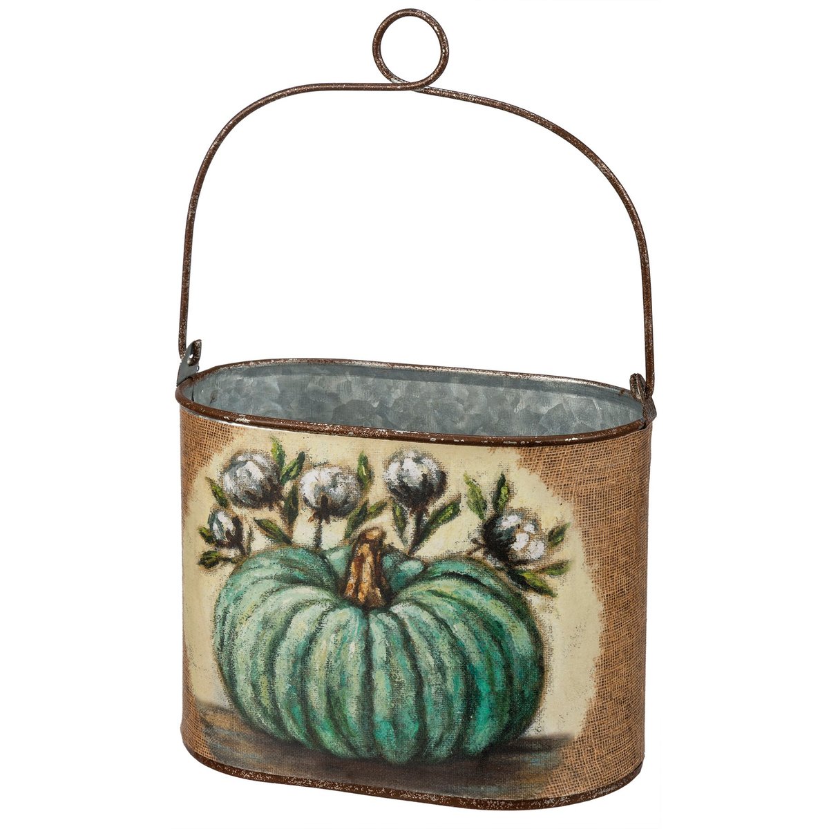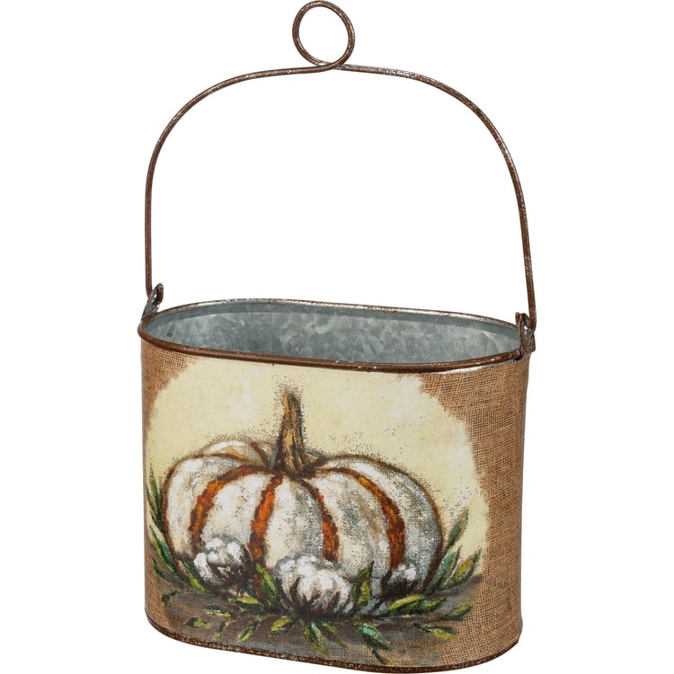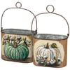 A set of two double-sided, rounded metal bins featuring multicolored pumpkin designs. designs are replicated from original artwork painted onto burlap canvas, giving the art a unique depth and texture. Contains metal handles for easy carrying.