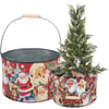 A set of two metal buckets in varying size from our Christmas Collection displaying wrap-around designs on each. Designs feature a vintage art collage of jolly Santas and reindeer. Perfect for holding holiday greenery or small décor. Greenery pictured not included. Our Vintage Christmas bucket set includes metal handles with wooden grips for carrying and stack inside each other for easy storage. A fun set of seasonal home accents with a variety of display options.