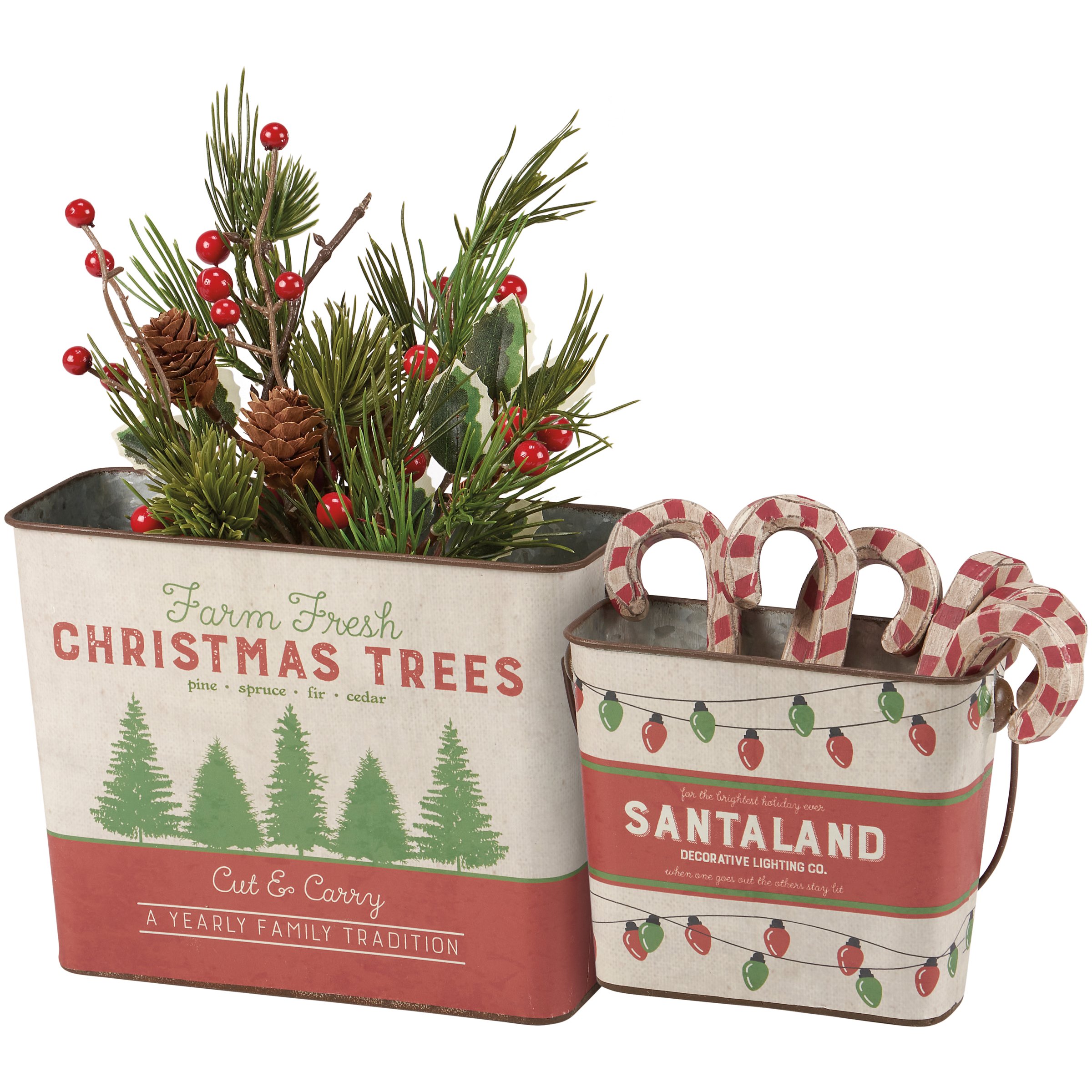 A set of two galvanized metal buckets in different sizes from our Christmas Collection. Each holiday bucket displays vintage Christmas themed designs. Larger bucket displays a "Farm Fresh Christmas Trees" sentiment with a coordinating Christmas tree farm design. Smaller bucket displays a "Santaland" decorative lighting company inspired design. Holiday bucket set is perfect for displaying seasonal greenery or décor. Accessories and greenery pictured not included. Our Santaland bucket set includes metal handles with wooden grips for easy carrying and stack inside each other for compact storage. A fun set of seasonal home accents with a variety of display options.