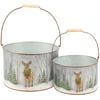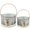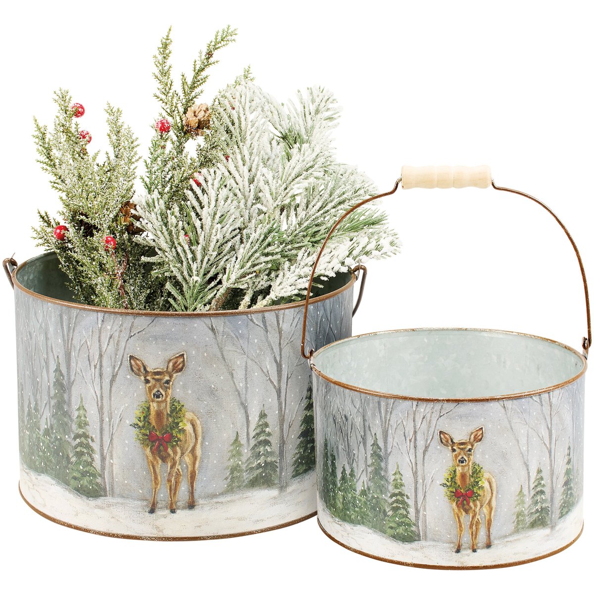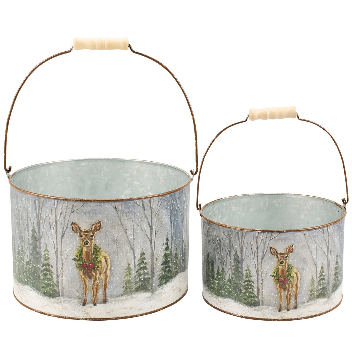 A set of 2 metal buckets in different sizes from ourĀ Christmas Collection featuring double-sided designs of a snowy winter scene with a deer wearing a Christmas wreath. Seasonal bucket designs are replicated from original artwork painted onto burlap canvas, giving the art a unique depth and texture. Bucket set is perfect for displaying Christmas greenery or storing household items in style. Greenery pictured not included. Our Snowy Deer bucket set includes metal handles with wooden grips for easy carrying and nest inside each other for compact storage. A set of rustic seasonal home accents with a variety of display options.