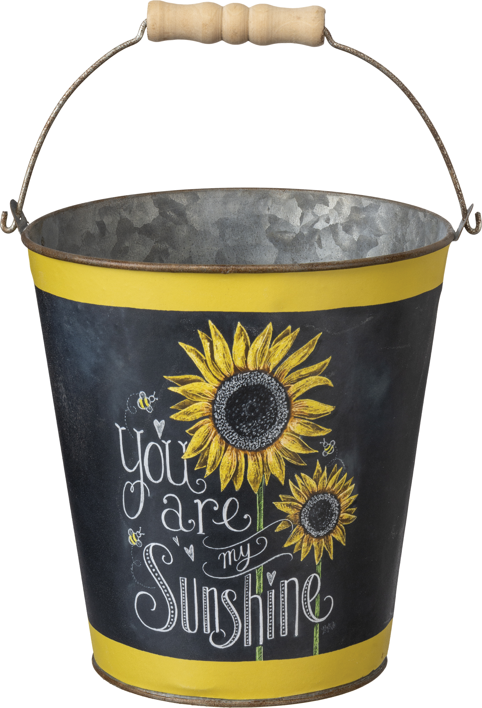 A set of two tin buckets with double-sided chalk art sunflower designs and "You Are My Sunshine" sentiment. Set complements well with other pieces in collection to create a cohesive display.