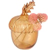 A vase from our Fall & Harvest Collection displaying a standing acorn design made from brown glass with sculpted details. Our Acorn bud vase features an opening on top perfect for holding a single stem or small bouquet of flowers. Greenery pictured not included. A stylish fall-themed home accent with a variety of seasonal display options.
