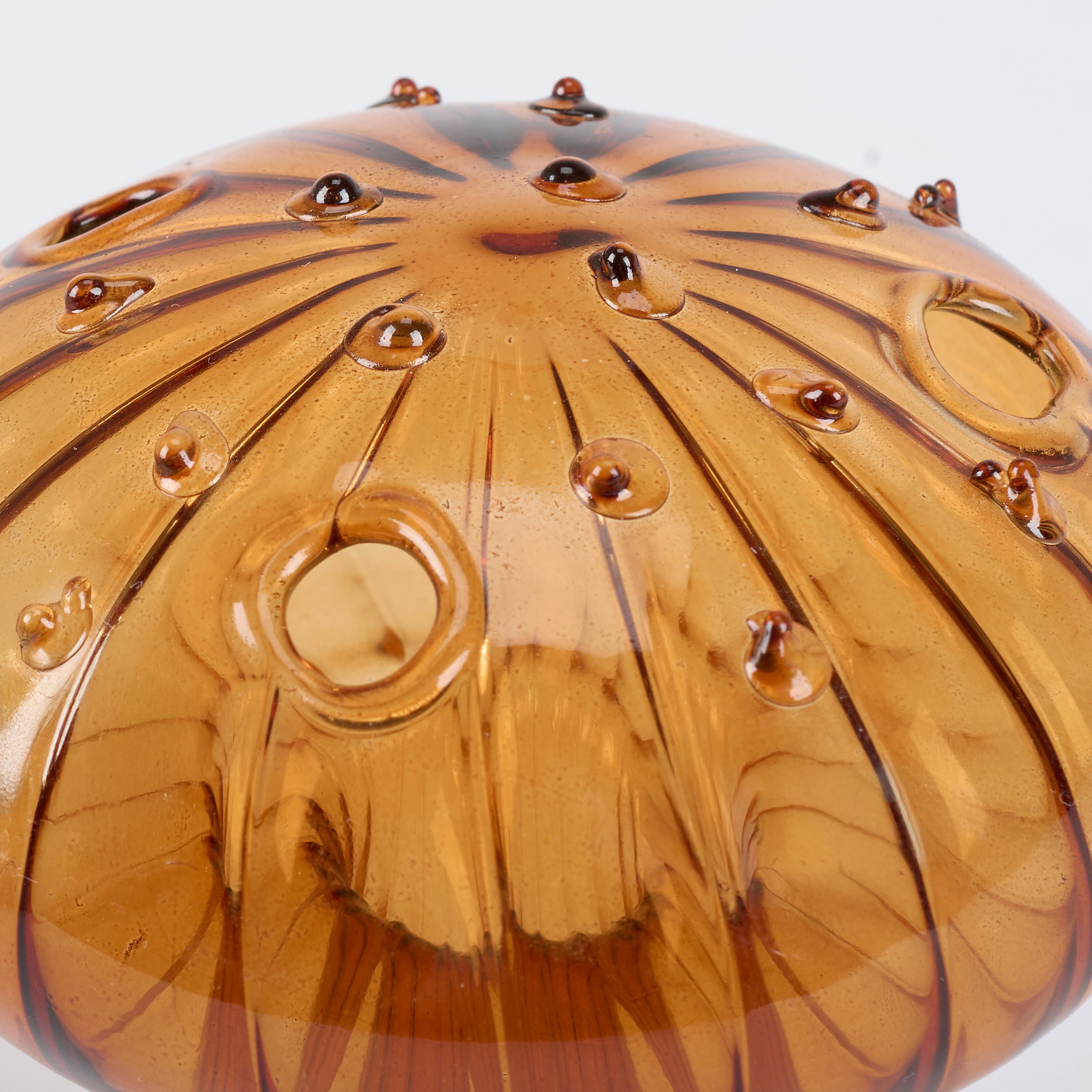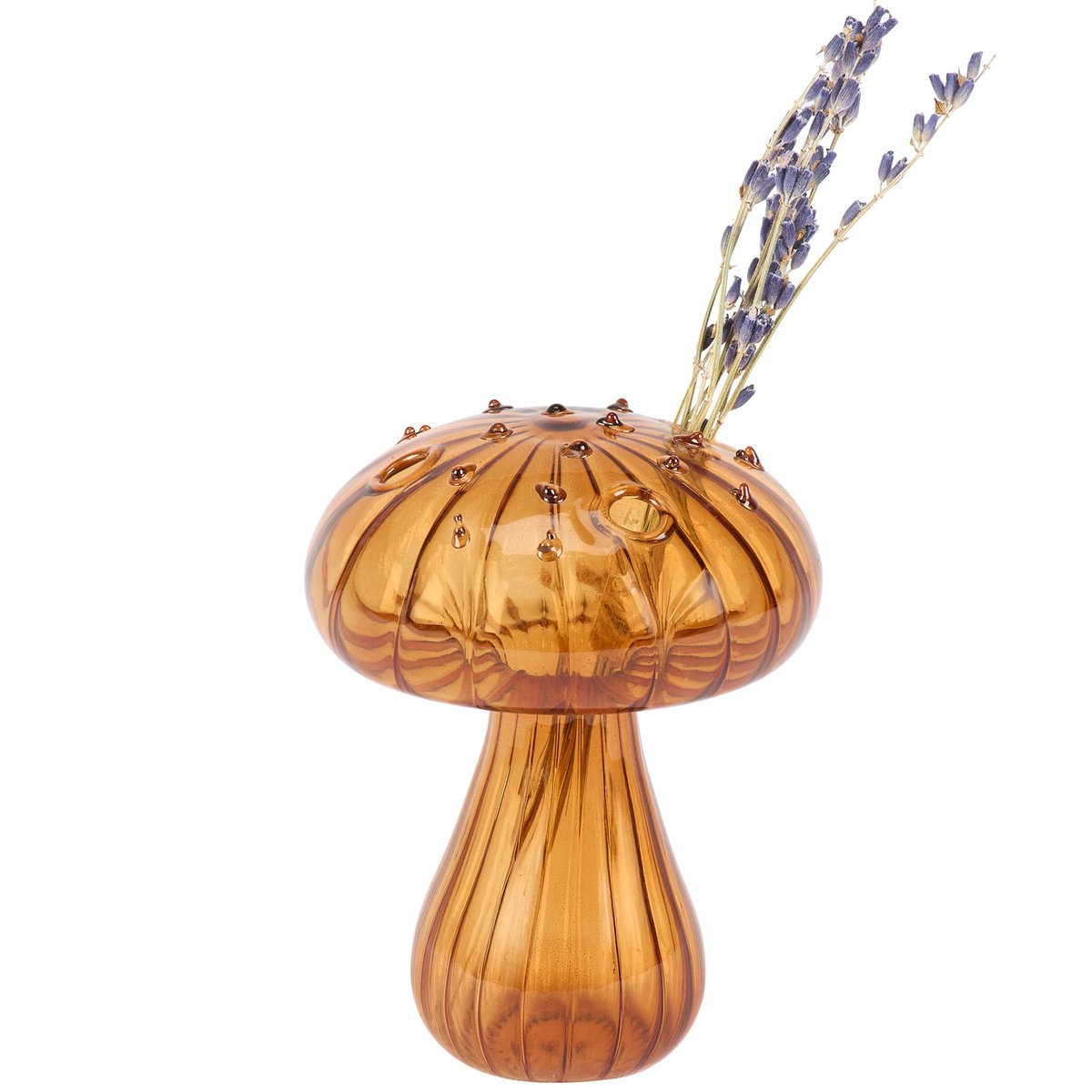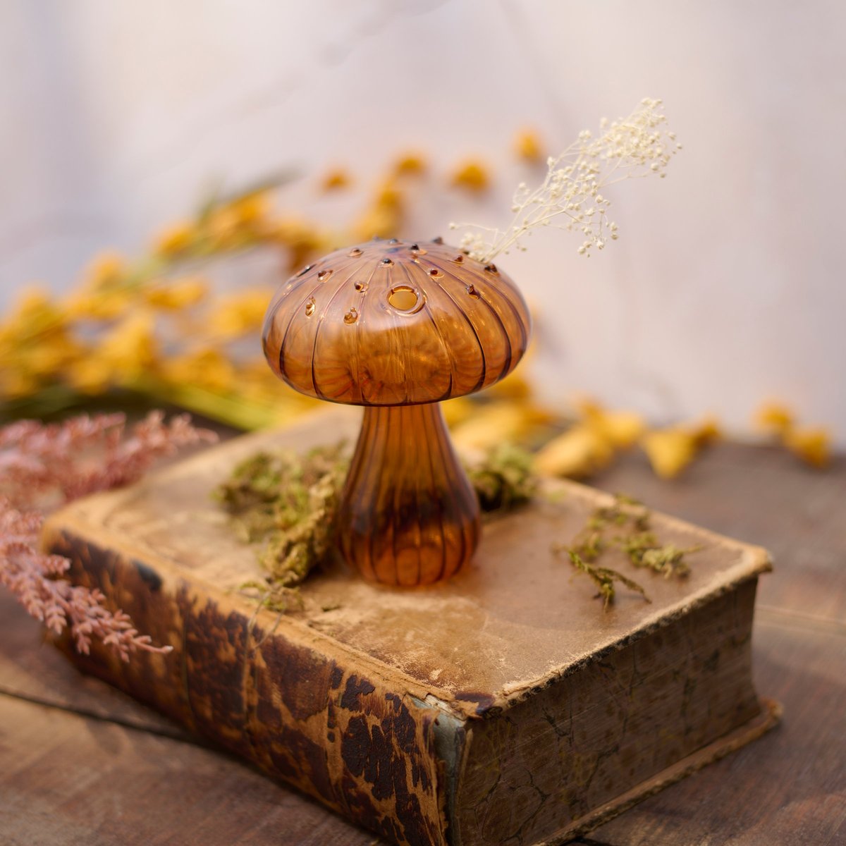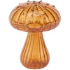 A vase from our Fall & Harvest Collection displaying a standing mushroom design made from golden brown glass with sculpted details. Our Golden Mushroom bud vase features openings on top perfect for holding single stems or small bouquets of flowers. Greenery pictured not included. A stylish fall-themed home accent with a variety of seasonal display options.