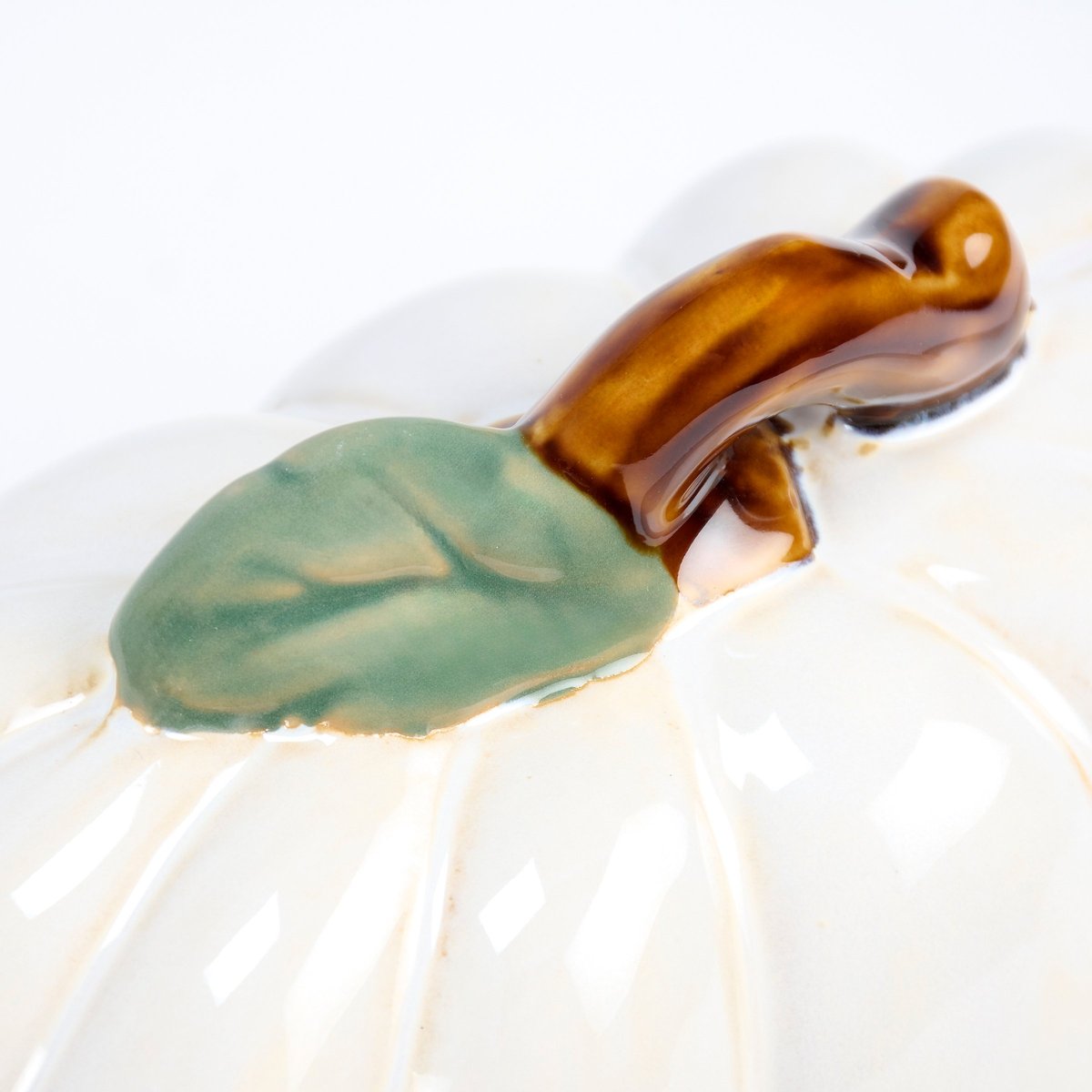 A stoneware butter dish from our Fall & Harvest Collection displaying a white pumpkin inspired design. Fall butter dish features a ceramic tray and lid displaying a sculpted white pumpkin design with stem and leaf detail. Hand wash only; not microwave safe. Our White Pumpkin butter dish is a piece of seasonal tableware perfect for fall gatherings.