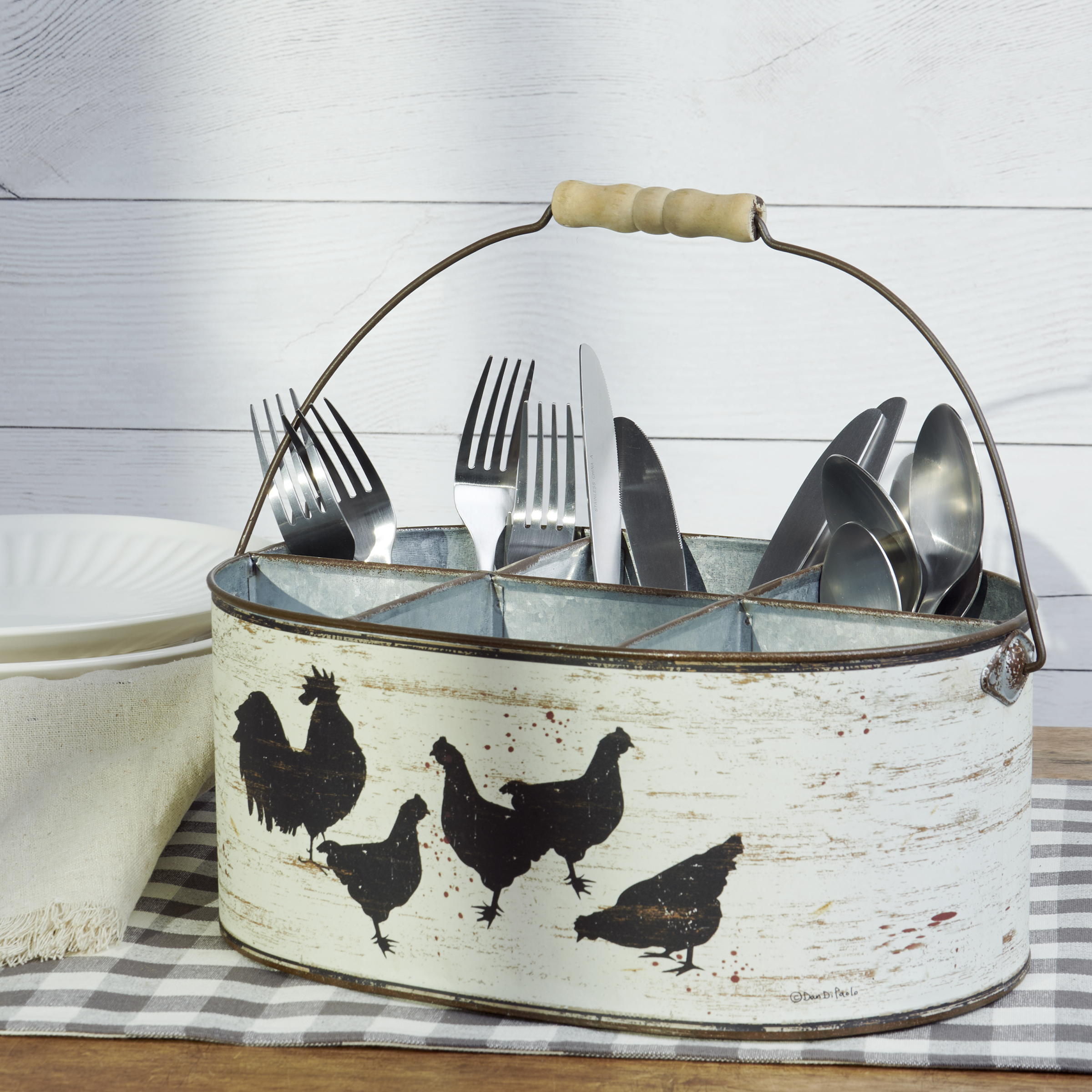 A galvanized metal caddy from our Farmhouse Collection featuring six sections perfect for organizing kitchen and dining items such as condiments or utensils. Caddy displays a full wrap-around rustic inspired design of farm animal silhouettes with distressed wood details. Our Farmhouse caddy includes a metal handle with wooden grip for easy carrying. Accessories pictured are not included. A rustic farm-themed kitchen accessory great for everyday use.