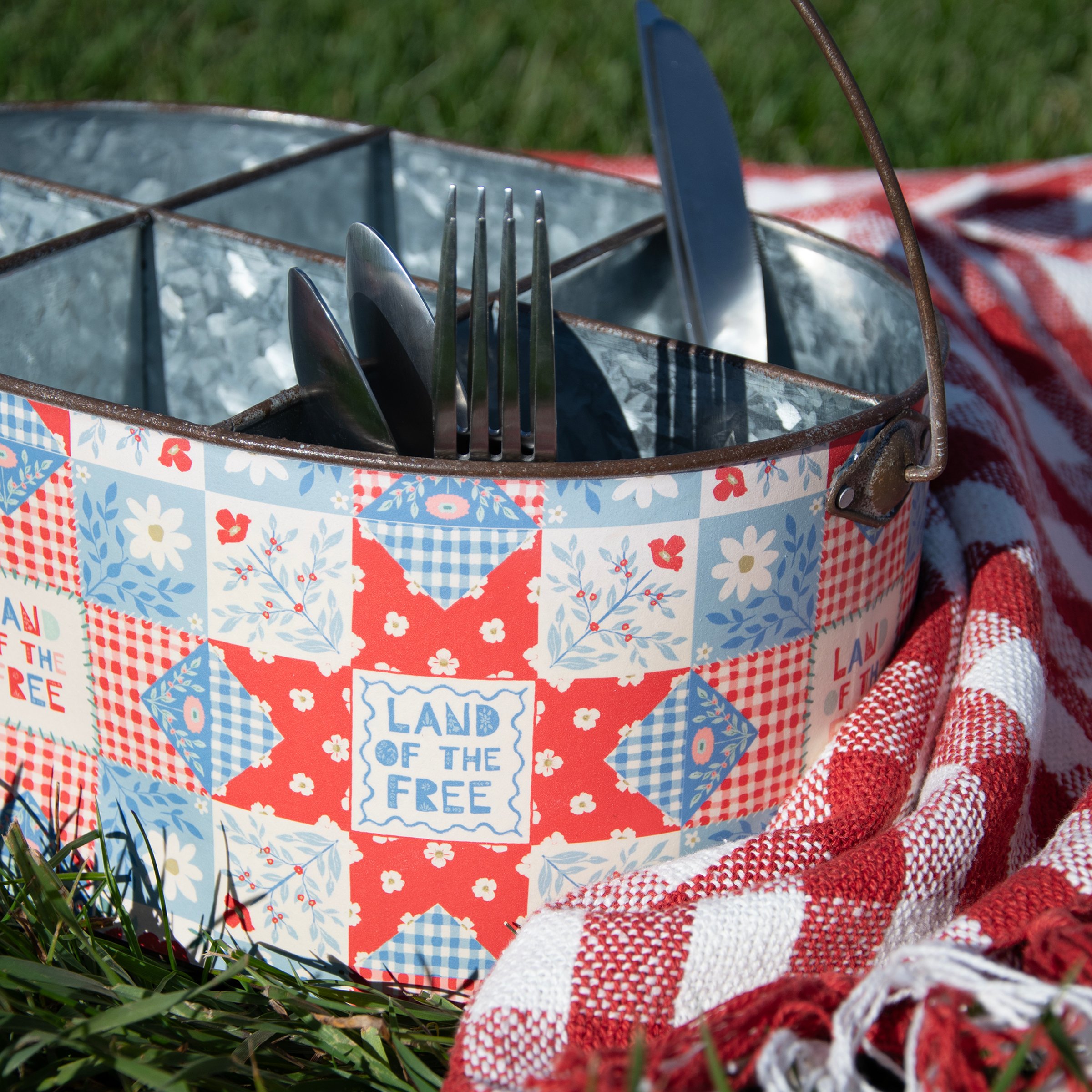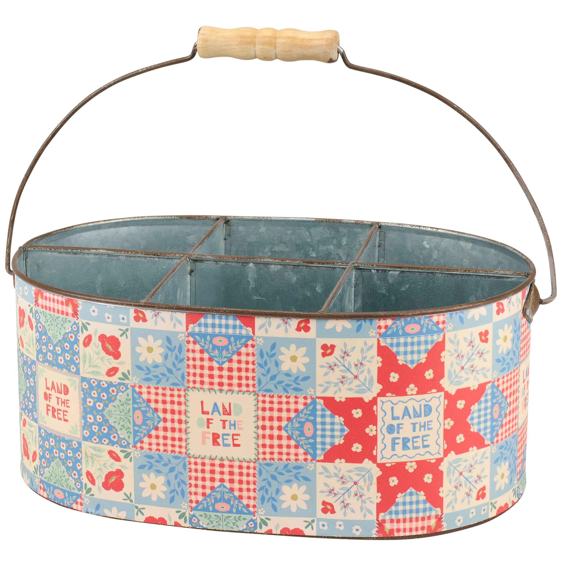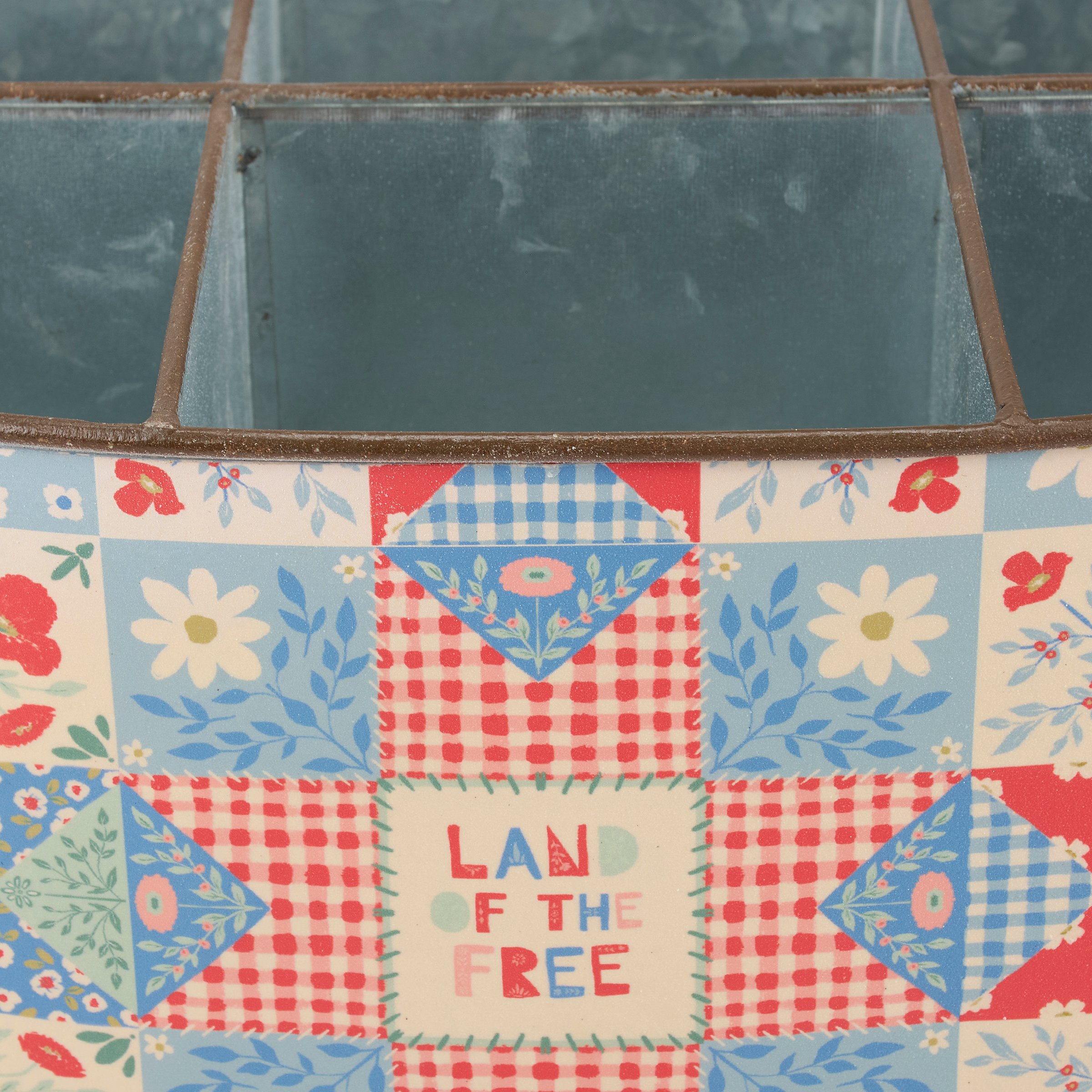 A galvanized metal caddy from our Patriotic Collection featuring six sections perfect for organizing utensils or dining items such as condiments or napkins. Patriotic caddy displays a double-sided design of folk art inspired quilt blocks with a soft American flag color palette and patriotic sentiment that reads "Land Of The Free." Our Land Of The Free caddy includes a metal handle with wooden grip for easy carrying. Accessories pictured are not included. Decorative use only; not food safe. A charming patriotic home accent ideal for seasonal decorating during 4th of July and Memorial Day or celebrating stars and stripes all year round.
