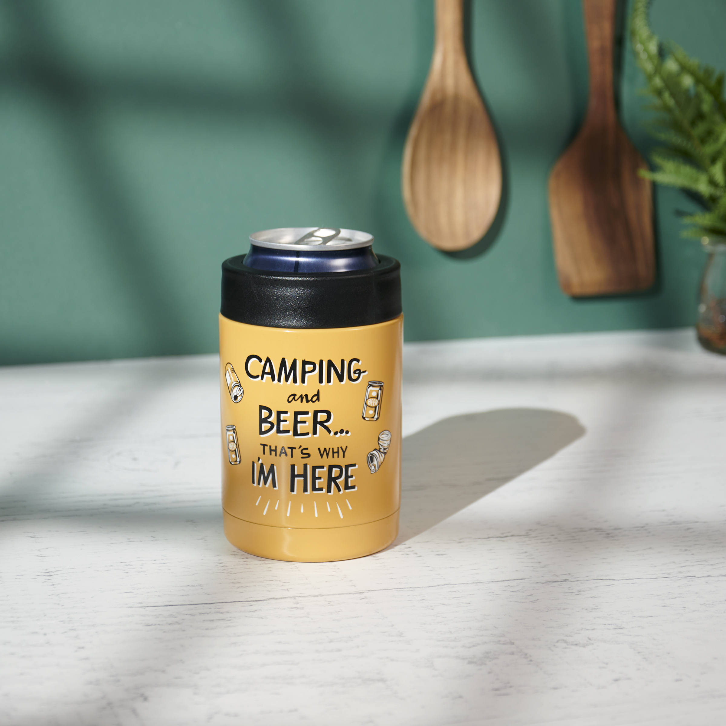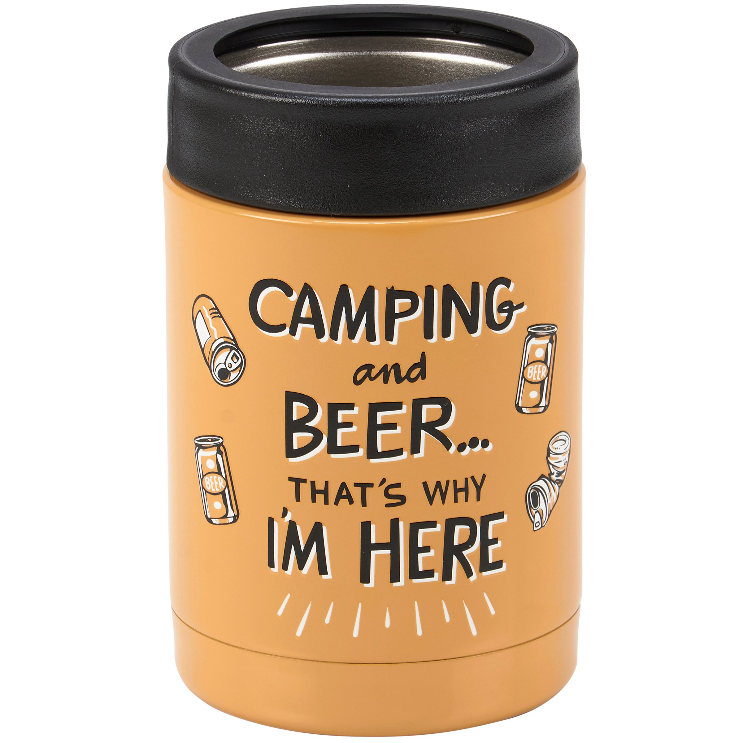 Perfect for warmer weather, this insulated can cooler from our Lake & Cabin Collection displays a fun hand illustrated scene of a campsite with beer can designs around a camping-themed sentiment that reads "Camping And Beer... That's Why I'm Here." Keep drinks cold up to 4 hours using the convenient screw-top lid to secure a 12 oz can inside the stainless steel cooler. Our Camping And Beer can cooler is hand-wash only. Do not microwave. A fun camping-themed accessory perfect for everyday use.